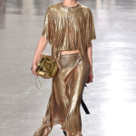 Comfort e tripudio di knitwear in passerella da Paco Rabanne: si torna agli albori, con una collezione che si ispira a quella denominata “Dodici abiti inindossabili”, risalente al 1966. In bilico tra ironia e sperimentazione, Julien Dossena gioca sui contrasti arditi, in una collezione iconica, che sperimenta l’inindossabilità dei capi attraverso note body-conscious che privilegiano però comfort come valore essenziale. Lo sportswear si unisce a note futuriste, in una collezione che non lesina in morbido knitwear per affrontare con stile il rigore invernale. Tute workwear declinate in tinte pastello si alternano a top e gonne, fino a capi metallizzati, tra note siderali e tocchi gold: largo ad asimmetrie e tocchi sparkling, che si alternano a pantaloni sartoriali dalle suggestioni atletiche. Femminilità e sperimentazione si uniscono in silhouette fluide e giochi cromatici otpical, che alternano arancio e bianco. Blu ghiaccio e argento impreziosiscono pepli asimmetrici, giallo e rosa tenue decorano morbido knitwear, mentre le mannequin sfoggiano una tote bag con il logo della maison. Fluidità ed armonia tanto nei due pezzi quanto nei dress tempestati da una pioggia glitter. Bodycon dress ad alto tasso erotico si alternano a casacche e tuniche preziose, tempestate da una pioggia di cristalli dorati. L’heritage più autentico della maison trova nuova ispirazione in una collezione iconica, che segna un ponte tra presente e passato.