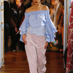 La sensualità senza tempo di capi iperfemminili si sposa con note tailoring, in una collezione eterea: Bouchra Jarrar, alla sua seconda sfilata per Lanvin, sceglie di addentrarsi attraverso atmosfere delicate e sognanti, che uniscono romanticismo e glamour. “Una femminilità tenera e forte”, quella perseguita dalla stilista, che ha commentato:” Non è un atto politico, ma nel mondo in cui viviamo oggi è importante dare bellezza e amore”. La collezione non lesina certo in bellezza allo stato puro, intrisa di note delicate, a partire dalla palette cromatica, che indugia in toni pastello, come il rosa pallido. In passerella parata di top model, dalla giovanissima Vittoria Ceretti a Bella Hadid, solo per citarne alcune. Ma se credevate di venire sopraffatti da un’irrefrenabile ondata di capi dalle suggestioni bon ton, sarete pronti a ricredervi clamorosamente: l’aura leggiadra delle prime uscite della collezione viene sapientemente stemperata da tailleur e suit dalle linee mannish, che bilanciano perfettamente la collezione conferendogli un tocco strong che non guasta. La musa di Jarrar ha un’anima bifronte: la stilista, che ha fatto il suo debutto nella maison la scorsa primavera, dopo il clamoroso addio di Alber Elbaz, resta fedele all’estetica del marchio, con una collezione che non lesina in pantaloni fluidi dal piglio sartoriale e giacche biker. Ma lo swing e la personalità della designer sembrano essere proiettati in un universo patinato che fonda le proprie radici in una femminilità in chiave couture. Ricordano quasi i costumi dell’Opera certi capi che si alternano sulla passerella, impreziositi da stampe iconiche, come i cigni, le fenici e gli uccelli esotici. Come un’etoile, la donna Lanvin ostenta tutù in chiave ready-to-wear, caratterizzati da scollo all’americana, maniche in pizzo e gonna in mousseline. Bluse romantiche si uniscono attorno al collo, in un gioco di silhouette: torna prepotentemente alla ribalta la vita alta, per gonne e pantaloni.