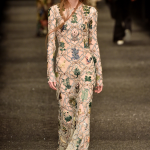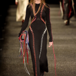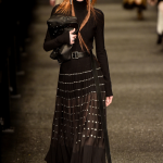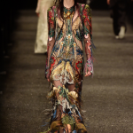 Suggestiva ed affascinante la collezione autunno/inverno 2017-18 di Alexander McQueen, tra le sfilate più attese nel calendario della settimana della moda parigina. Un viaggio in Cornovaglia ispira a Sarah Burton una collezione che guarda al passato, lasciandosi ispirare da echi millenari: il folclore della Cornovaglia, con le sue antiche leggende e l’artigianalità costituiscono ispirazione privilegiata, che dà vita a mirabolanti virtuosismi stilistici, in bilico tra passato e presente. La stilista diviene deus ex machina, inedita voce narrante di un racconto epico: nessuna novità fin qui, dal momento che l’heritage del brand da sempre predilige un’estetica intrisa da contrasti vibranti, in bilico tra punk ed echi vittoriani di antica memoria. L’immenso patrimonio storico del Regno Unito viene questa volta visualizzato in tutta la sua forza, fatta di storie dal fascino millenario, che trovano degna rappresentazione in paesaggi ancora vergini. Come un’eroina maledetta, un’eterea creatura in bilico sulle impervie scogliere della Cornovaglia, la musa di Sarah Burton sembra voler rivelare allo spettatore la magia di universi sconosciuti, leggende millenarie tramandate nel silenzio di Bedruthan Steps, impostasi come principale meta turistica già durante l’età Vittoriana. La leggenda tramanda la triste parabola di Bedruthan, gigante buono che trovò la morte in quell’angolo paradisiaco. La mitologia pagana e le tradizioni arcaiche della Cornovaglia trovano nuova incarnazione nel défilé: è in particolare la tradizione del Cloutie ad ispirare la stilista, che si cala quasi in un’osservazione partecipante dei riti del folclore locale, toccando vette inusitate pervase dagli echi romantici di una lirica struggente. Sfila una guerriera pagana strizzata in una sorta di armatura tribale, in bilico tra pelle dal mood aggressive e mirabolanti giochi cromatici che omaggiano la più fine artigianalità manifatturiera. Largo a stampe patchwork dal forte impatto scenografico che impreziosiscono prezioso jacquard; le silhouette sono lineari e indugiano talvolta alla più sfrontata sensualità, tra body in knitwear ed effetti grafici caleidoscopici che raffigurano la fauna e la flora in chiave simbolica. Chiudono il défilé capi da gran soirée tempestati da piume e da una pioggia di pietre preziose, a strizzare l’occhio a note couture.