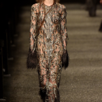 Nel centesimo défilé della maison, Dries Van Noten sceglie di portare sulla passerella del prêt-à-porter i capi e i volti che hanno incarnato la maison dagli albori, contribuendo a renderne iconico lo stile. Un femminismo in chiave fashion diviene protagonista assoluto della collezione autunno/inverno 2017-18. Correva l’anno 1992 quando lo stilista sfilava per la prima volta: un’anniversario che Van Noten decide di celebrare in grande stile, senza lasciarsi andare ad echi nostalgici ma giocando molto con le ispirazioni eterogenee che hanno contraddistinto gli ultimi venticinque anni della sua estetica. Calcano la passerella parigina le top model che hanno incarnato al meglio lo stile del brand, alternandosi come vestali strette in maxi dress e tailleur oversize in stampa floreale: ecco Kristina de Conick, che apre il défilé seguita dai volti più celebri degli anni Novanta, come Amber Valletta, Anne Catherine Lacroix, la sempre splendida Carolyn Murphy, Alek Wek, Cecilia Chancellor, Élise Crombez, Erin O’Connor, Esther de Jong, Guinevere Van Seenus, Kirsten Owen, Liya Kebede e Nadja Auermann —che si sono alternate ai volti di oggi. Una collezione pervasa da note strong, che omaggia una femminilità audace che non lesina in self-confidence. Bella e consapevole, la donna di Van Noten utilizza l’abito come mezzo per esprimere se stessa. Potenti gli echi immaginativi veicolati dalle stampe che si alternano in passerella, tra silhouette costantemente in bilico tra i gender, in una mirabile bilancia tra note mannish ed audace femminilità: se le spalle tendono ad essere oversize, impregnate da tagli sartoriali ad alto impatto scenografico, le maniche in fake fur che impreziosiscono certi capispalla accanto a grafismi optical indugiano invece ad una dolcezza tipicamente femminile. Velluti preziosi e sete si alternano a pellicce, rigorosamente fake, tra capispalla sartoriali e note teatrali, che trovano apogeo nel finale del défilé, che vede circa 50 mannequin invadere la passerella, come in una marcia iconica, che celebra la valchiria di Dries Van Noten.
