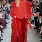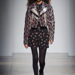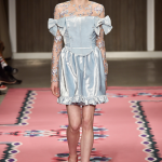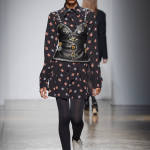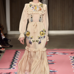 Suggestioni Forties ed atmosfere circensi caratterizzano la collezione autunno/inverno 2017-18 di Vivetta: lunghi abiti dal mood etereo impreziositi da balze e rouches si alternano ad intarsi preziosi e a ricami dal piglio surrealista, in una collezione onirica ed affascinante. Vivetta Ponti resta fedele alla propria estetica, pur spaziando in un caleidoscopio di ispirazioni eterogenee, che danno vita ad una sfilata suggestiva. La designer, che il 6 marzo scorso ha inaugurato un pop up store presso la Rinascente di Milano, che sarà seguito da un altro store presso le Bon Marché, a Parigi, sceglie di ispirarsi alle atmosfere del circo degli anni Quaranta. Innumerevoli i dettagli di stampo surrealista, come il pierrot riprodotto sui tacchi delle scarpe, che rivela un’attenzione certosina per i dettagli. L’iconografia circense pervade l’intera collezione, tra note giocose ed irriverenti, che si alternano mirabilmente al romanticismo di lunghi abiti delicati, emblema dello spirito del brand. Rosa cipria viene declinato su sete preziose e maxi dress in tulle, mentre i mini dress ricordano i tutù delle ballerine, impreziositi però da fiocchi bon ton. I capispalla rivelano colletti animalier che si alternano a ricami paillettati raffiguranti Arlecchino, in una masquerade onirica che impreziosisce abiti in velluto a maniche lunghe: ecco che unicorni e maschere fanno la loro comparsa, figure ancestrali che si ripetono in un carosello infinito, proiezioni di un subconscio ricco di sfumature. Iperfemminile e delicata la collezione include bluse colorate e capi in pizzo che rivelano le intricate trame di una sartorialità di antica tradizione: passamanerie ardite e note ladylike si alternano nel défilé, in una collezione che sarebbe piaciuta ad Elsa Schiaparelli. Largo a note knitwear negli inserti di giacche da indossare con pantaloni en pendant, interamente tempestate da cristalli Swarovski in nuance dégradé. Vivetta Ponti esplora nuovi territori pur restando fedele all’estetica da lei stessa sdoganata.