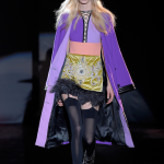 Sulla passerella di Prada si respira un’aria nuova: per l’autunno/inverno 2017-2018 Miuccia Prada elabora un’estetica inedita, interamente basata su una riscoperta della femminilità. Seducente e maliziosa, la donna Prada diviene protagonista assoluta sulle passerelle milanesi, tra abiti a sirena, cappottini profilati di piume di marabù e citazioni che rimandano al glamour cinematografico. In un caleidoscopio di frange, piume e suggestioni Seventies sfila “La Città delle Donne”, un’armata di donne consapevoli e agguerrite: l’intento da cui parte Miuccia Prada è molto chiaro, la parola d’ordine è sedurre. «Mi sono interrogata sugli strumenti della seduzione», così ha dichiarato la stilista, protesa nel tentativo di forgiare una nuova identità, che pone accanto all’heritage del brand note inedite, per una femminilità fresca e prorompente. Sulle note techno dei Cardopusher la donna Prada attraversa un catwalk dai toni domestici, accanto a letti e lampade: i poster di Robert McGinnis e le locandine di pellicole celebri, come Colazione da Tiffany, decorano le pareti di un set originale, in cui si muove sicura la musa della stilista. Largo a knitwear prezioso lavorato a mano, impreziosito da disegni floreali; i cappottini bon ton si aprono ad inaspettati coup de theatre, per una femme fatale che non teme di sfoggiare le sue armi per sedute. Gli anni Settanta sono protagonisti, per capispalla e cappelli dal piglio lady like; non mancano i gioielli, come le perle. Le gonne rivelano spacchi ad alto tasso erotico, sapientemente smussato da cuissard flat. Largo a gonne a matita, cardigan, giacche sartoriali e capispalla in velluto a coste, tweed, shirling e jacquard, mixati in un pattern audace, tra note arancio e rosso fragola. Il grunge più sofisticato, mirabile interpretazione dell’eleganza effortlessy-chic, si arricchisce di spunti nuovi, per una sirena metropolitana che ostenta femminilità da vendere, stretta in abiti a sirena che ne enfatizzano la silhouette.