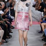 Il glamour in maison Carven si veste di effetti sparkling con cristalli ton sur ton che splendono su abiti cocktail con stampa astratta, su top e sui taschini delle camicie.