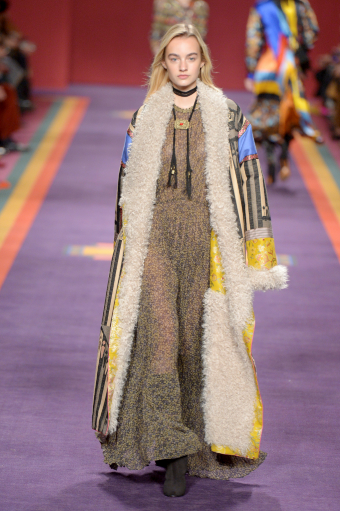 La designer inneggia ad un sentimento di fratellanza universale, per una comune di donne dallo spirito intrepido e dal guardaroba chic: ecco quindi in passerella la “Etro Paisley Tribe”, una tribù contemporanea che raduna spiriti liberi, viaggiatrici indomite che hanno attraversato i cinque continenti, accumulando un notevole bagaglio culturale. In un irriverente mix & match si alternano fiori e righe, diamanti e dragoni, mandala e animalier, tra artigianalità ed arte. Il folclore dei popoli andini rivive sulla passerella, mixato a note streetwear che ne enfatizzano la teatralità, declinandola in chiave contemporanea. Largo a jacquard e broccati preziosi, alternati a montoni e maxi coat profilati in pelliccia.