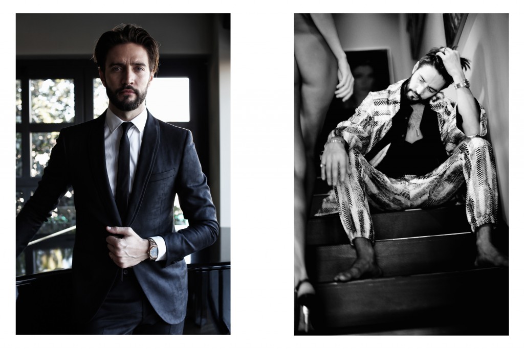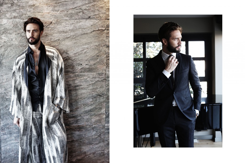 A sx Completo kimono dal richiamo marino La Perla, camicia in popeline nera Corneliani – dx completo smoking con trama damascata Corneliani