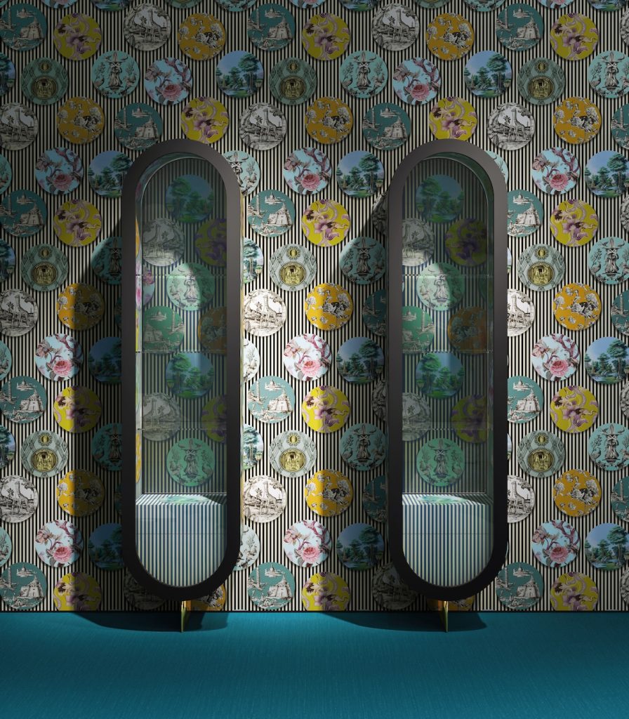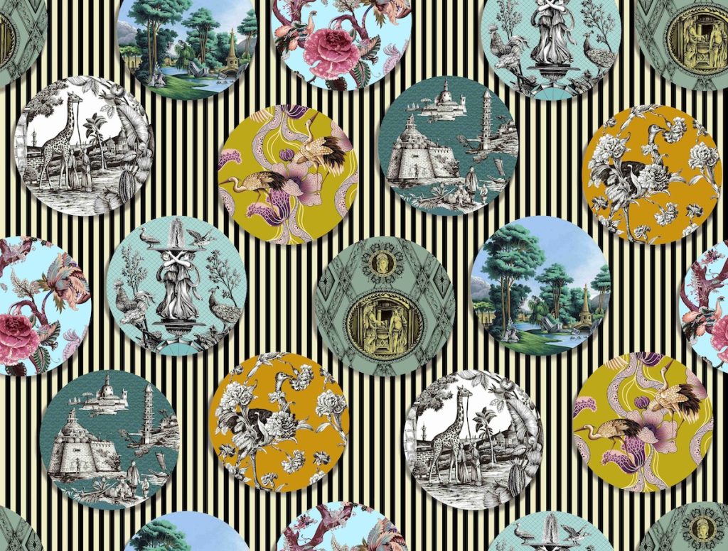 Le nuove carte da parati di Simone Guidarelli, “Souvenirs de Voyage”, disegnate a mano nella versione Eco in cellulosa e PVC free, dai colori super brillanti nonostante la resa opaca, rappresentano il punto di arrivo di un viaggio nella memoria. I sentimenti riaffiorano e si traducono in immagini su piatti con motivi orientali, fontane rinascimentali, aironi, giraffe e struzzi, particolari giunti direttamente dai pattern di successo delle precedenti collezioni, tutto trova il suo posto nel filo conduttore della rievocazione vivida di un passato vissuto o immaginato. Ad ispirazione le foto ricordo messe su carta e i piatti souvenir degli anni ’70 in ritorno dai viaggi, cartoline traccia di un’esperienza felice. L’idea è quella di un viaggio tra ricordi e pensieri, come quando si osserva il panorama da un finestrino del treno. Si aggiunge una seconda carta da parati chiamata “Souvenirs de Voyage” Bamboo dove i piatti sono incorniciati in delicate canne di bamboo.