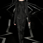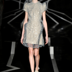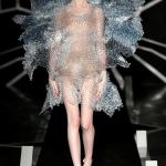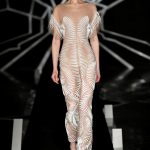 Suggestiva ed altamente evocativa la passerella: su una piattaforma circolare giace in un sonno profondo la star de Il trono di Spade, mentre braccia robotiche in 3D la vestono, tessendo sul suo corpo un abito circolare dalle intricate geometrie. Il défilé è intitolato Quaquaversal: un nome altisonante, che rende onore alle stampe 3D, che si stagliano su tutte le direzioni.