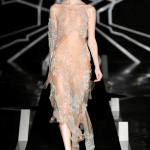 Eterea, sognante, la donna che sfila sulla passerella di Iris van Herpen è una creatura fluttuante, quasi una silfide, ninfa dell’immaginario poetico: ieratica ed affascinante, ipnotizza e cattura l’occhio la sua eleganza ibrida, fatta di abiti leggeri e quasi impalpabili. La silhouette futurista abbraccia la fantomatica silfide conferendole un’aura quasi divina: largo ad abiti-scultura tagliati al laser, silicone trasparente, plissé d’organza e tulle, ma anche cristalli, che avvolgono l’eterea creatura.
