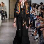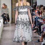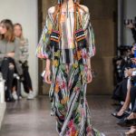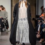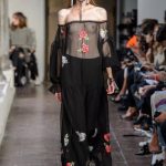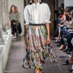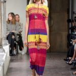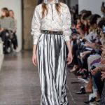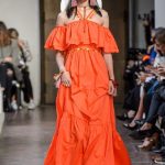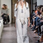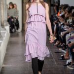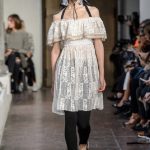 Lontano dagli eccessi, questo défilé viene scandito da oblò arricciati e ruches. La coulisse, motivo ricorrente nella sfilata, segna la vita dei capi.