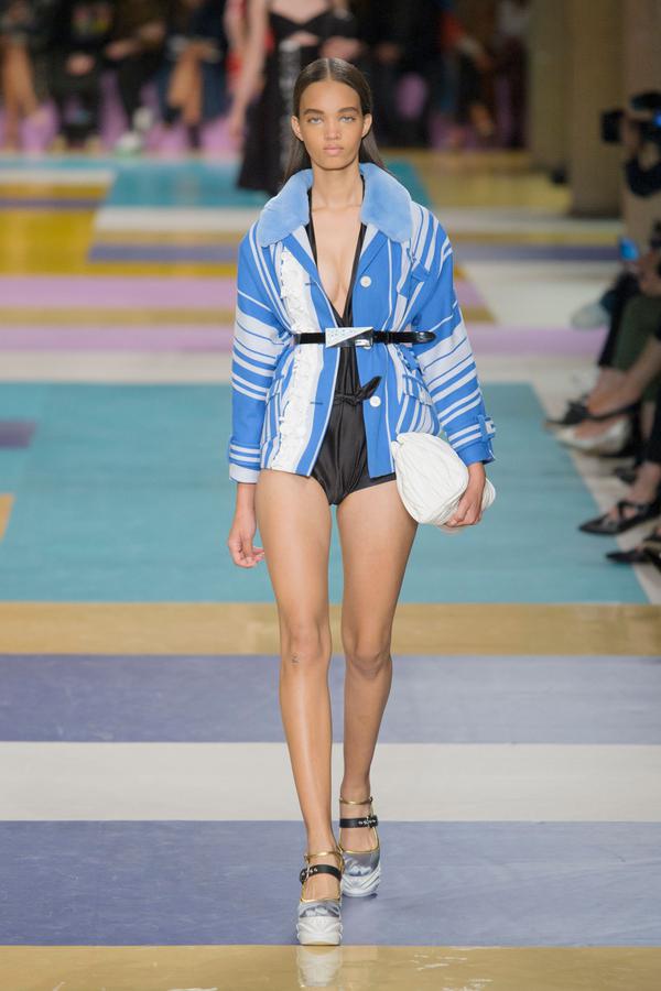 Sfilano prendisole, sottane, ciabattine e completi in spugna, per un’estetica candy, a metà tra Mad Men e The Stepford Wives: largo a bluse, trench e zeppe intagliate, tra fiori e rouches. Un’eleganza raffinata ma anche ricca di sfumature funny, per un’estate da vivere intensamente. E Miuccia Prada riesce a trasportare l’atmosfera estiva sulla passerella, intento dichiarato dalla stessa stilista. Tra le modelle che calcano il catwalk la splendida Gigi Hadid.