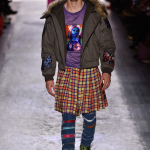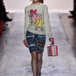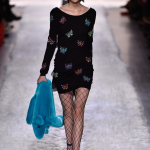 Irriverente, provocatoria, a tratti dissacrante: la collezione autunno/inverno 2017-2018 di Jeremy Scott è riuscita anche questa volta a monopolizzare l’attenzione della fashion week newyorkese. Lo stilista sceglie come figure di riferimento cui ispirarsi icone del calibro di Elvis, Michael Jackson e Gesù Cristo, in bilico tra glam e suggestioni escatologiche. L’enfant terrible della moda americana sceglie l’idolatria come punto di partenza della sfilata, in un crogiolo di ispirazioni e citazioni che spaziano dalla Barbie doll al glam anni Settanta, dalla femminilità Fifties alla religione: ecco l’iconografia di Gesù fare capolino da t-shirt e felpe, mentre abitini più simili a babydoll sdoganano lo slogan “l’amore puzza”. Largo a pellicce in tinte neon che profumano di Seventies, tra capelli rosa shocking e citazioni glam rock; apre la sfilata una Gigi Hadid strizzata in completi da cow girl, tra ironia all over ed idolatria. Nel front row spiccano Kylie Jenner e Sofia Richie. Sfilano note animalier e glitter all over, tra calze a rete e tocchi fur: la palette cromatica abbraccia le tonalità baby. In passerella sfila una party girl strizzata in iconici capisaplla glitterati, tra pelliccia e mini dress iconici tempestati di paillettes e pelle nera dal mood aggressive: opulenza ed overdressing negli sfarzosi capispalla con inserti di pelliccia, tra stampe leopardate e velluti preziosi. Non mancano come di consueto le stampe cartoon, cifra stilistica di Jeremy Scott, e capi che evocano innocenza giovanile, come le ciglia finte disegnate sugli occhi delle modelle. Jeremy Scott non si smentisce nemmeno stavolta, portando una ventata di aria fresca sulle passerelle della Grande Mela.