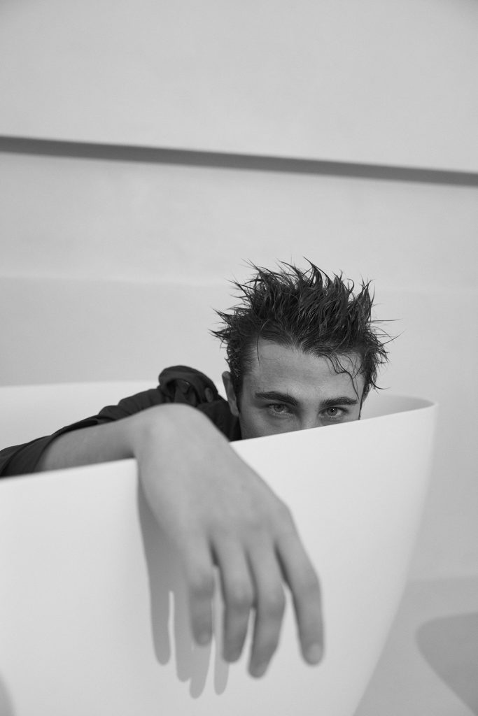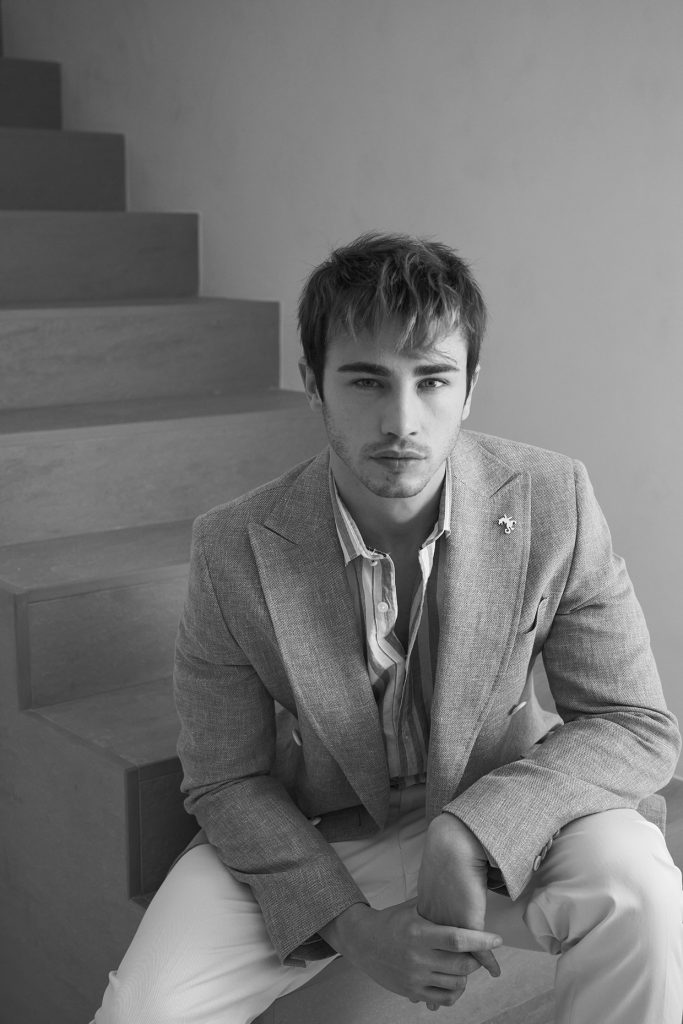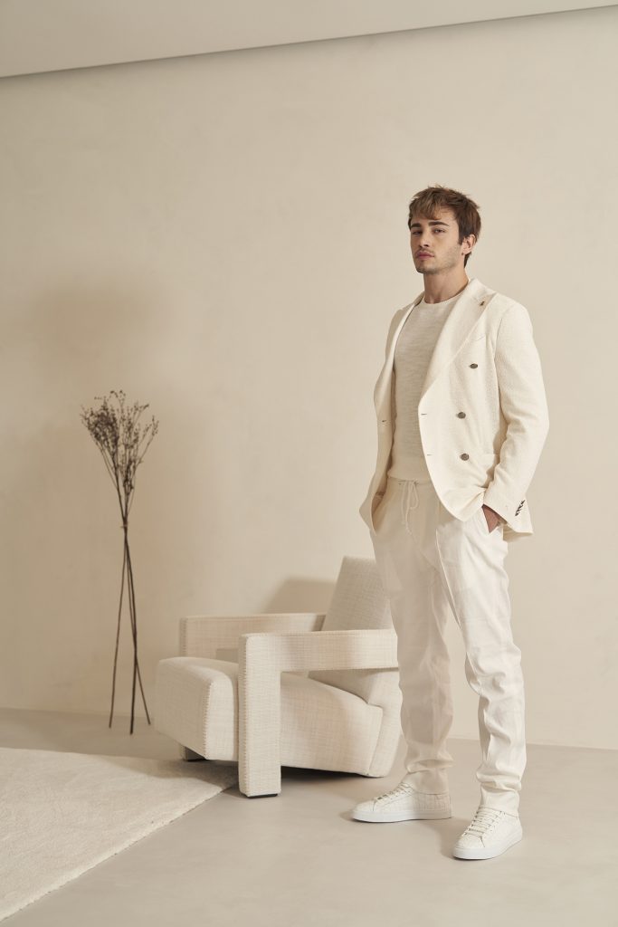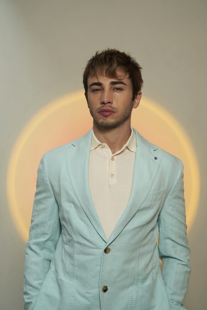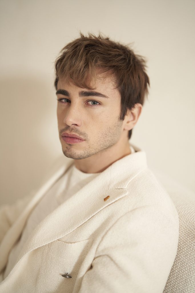 L’atmosfera è ovattata, quasi eterea, il candore vellutato del tappeto panna accarezza il bianco della poltrona Utrecht di Cassina; di Riki, in total white in questa scena, buca solo il ghiaccio dei suoi occhi, che molto dicono ma molto lontano dal tenero.