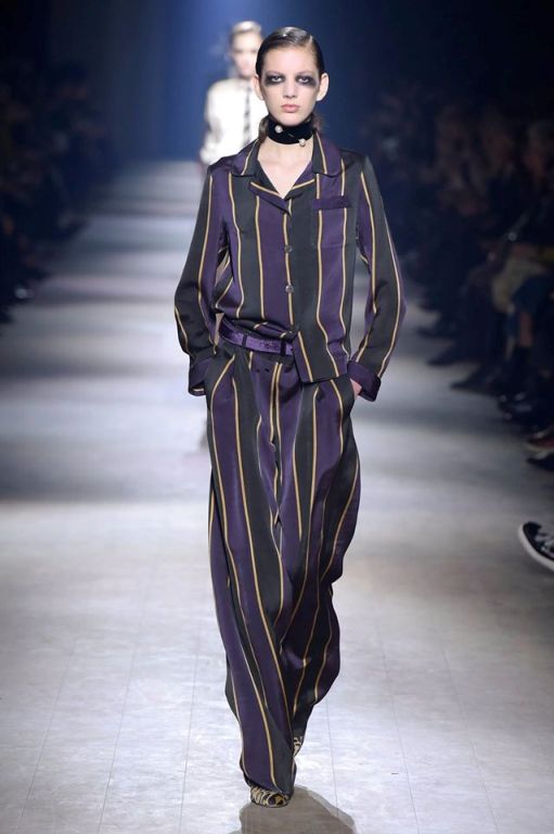 La collezione autunno inverno 2016-17 gioca sull’ambiguità di genere e un esotismo ostentato. Smokey eyes, cascate di perle e piume, silhouette allungate insieme a faux-fur e stampe animalier ripercorrono l’ossessione per il diverso, l’estraneo, l’esotico dei primi decenni del ‘900. I completi pigiama, le vestaglie, i pantaloni maschili dalla linea fluida sono invece ispirati ai poeti decadenti e al tema, a loro tanto caro, dell’ambiguità dei sessi. Non solo d’Annunzio, ma anche Oscar Wilde e George Sand ispirano la figura del dandy moderno in cui maschile e femminile si fondono. Panciotti e tuxedo, golfini da collegiale e abiti animalier dai colori sgargianti, reinterpretati con la moderna raffinatezza della moda parigina. Definito dal New York Times “uno degli stilisti più celebrali” per le colte citazioni che affollano le sue collezioni, Dries Van Noten sorprende la Paris fashion week con uno stile ancora una volta incantevole e conturbante.