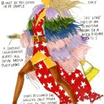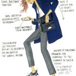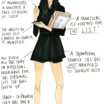 Tredici illustrazioni irriverenti che mostrano come per il mondo della moda questa settimana (e le tre a seguire di Londra, Milano e Parigi) siano cruciali. Nei disegni di Julie Houts c’è la pr di nero vestita, che non dorme da giorni e manda email a raffica. La celeb che si addormenta sul front row, forse stremata dall’afterparty della sera prima. E ancora la giornalista che sceglie la praticità perché “è lì solo per fare il suo lavoro“, la semi-sconosciuta che cerca di intrufolarsi in prima fila, la modella fuori servizio che nasconde la sbronza continuando a bere con nonchalance. La Guida illustrata al fashion month prende in giro gli outfit più stravaganti e i tagli di capelli più costosi, echeggiando la domanda: come vestirsi alla fashion week? La più divertente, però, è la fashion blogger che si dichiara distrutta tra uno show e l’altro, lamentandosi nell’enorme quantità di party a cui è costretta a partecipare. Salvo poi sbraitare contro la pr se non la fa entrare all’evento più cool della settimana della moda. Chiamasi: fear of missing out.