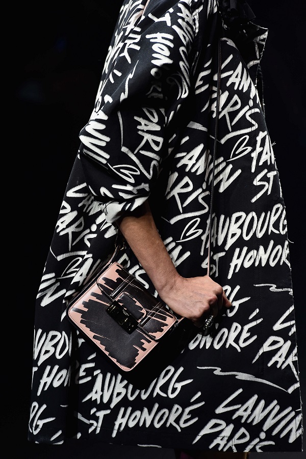 Suggestioni Roarin’ Twenties nei mini dress con frange stile Charleston si uniscono a capi in raso impreziositi da paillettes e cappottini a stampa animalier. Corsetti in vista, pizzo nero e stampe ardite su mini abiti dalle ruches iperfemminili. Si continua con lunghi abiti stampati e dettagli di stampo vintage, come i fiocchi e le camicie. Uno stile che ricorda da vicino le Groupie anni Settanta. Collane di perle e altri vezzi femminili divengono marchi distintivi della celebre maison fondata nel lontano 1885 da madame Jeanne Lanvin, e vengono ora riproposti come iconiche stampe su abitini, borse e capispalla.