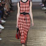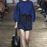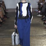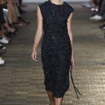 Una stampa a rete si avvolge intorno al corpo, quasi a voler catturare chi la indossa, prima di lasciarla andare. Catene navali si trasformano in righe ben definite, che abbracciano il corpo in crêpe de chine fluidi. Il set, intitolato “Superwalk”, segue il cambio di stagione. Lo studio di design Formafantasma ha trasformato gli interni del Palazzo delle Poste di Milano (progettato da Luigi Broggi agli inizi del ’900) in un’installazione fatta di fogli trasparenti in PVC neri, giallo brillante e color nudo. Appesi al soffitto scendono sul pavimento della passerella, dove creano uno spazio esteso e apparentemente infinito. Un muro, costruito con mattoni di terracotta, crea contrasto con gli interni futuristici e completa le linee decise dell’installazione e della collezione stessa.