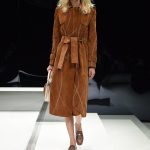 Il camoscio confeziona maxi coats e biker jackets. Nell’intensificarsi della sfilata, sulla passerella giunge un magnifico spolverino in pelle laserata: la ricchezza di questa collezione viene dettagliatamente esplicitata da questo capo.