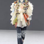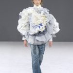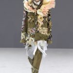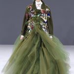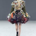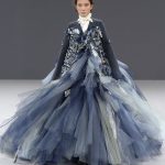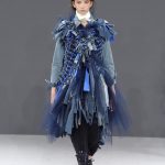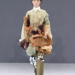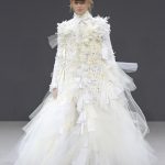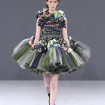 Soave ed eterea la donna che calca la passerella della collezione haute couture primavera/estate 2017 di Viktor & Rolf. Una sfilata intrisa di suggestioni surrealiste che si muovono su uno scenario che intende omaggiare la bellezza dell’imperfezione. Viktor Horsting e Rolf Snoeren stupiscono con capi caratterizzati da costruzioni ardite ed inedite stampe patchwork: ecco frammenti di abiti da cocktail dal piglio vintage che vengono cuciti su sontuosi abiti da sera: sperimentale e suggestiva, la collezione attinge a piene mani da un repertorio sconfinato, che strizza l’occhio a numerose epoche storiche e a stili multiformi: tra silhouette anni Quaranta spiccano giochi di tulle per gorgiere e drappeggi surrealisti, tra decostruzioni ardite e volumi scultorei. In un atelier immaginario veniamo proiettati all’interno del processo stesso di realizzazione dei capi, riassemblati insieme con la tecnica del Kintsugi: largo a macro sculture floreali e inediti mix & match che uniscono abiti da sera e da cocktail in un inedito sincretismo dal sicuro impatto scenografico. La tecnica giapponese del Kintsugi diviene protagonista assoluta di un guardaroba inedito che non lesina in suggestioni rétro: i capi dimenticati nell’armadio assumono nuova vita grazie a sapienti riassemblaggi che danno vita a suggestioni nuove. Il riuso ora profuma di couture, divenendo protagonista di una collezione onirica, a partire dal titolo, Boulevard of broken dreams. E sono proprio i sogni infranti a rivivere sulla passerella: memorie dimenticate di abiti sontuosi mai indossati o che hanno reso indimenticabili i nostri ricordi custoditi gelosamente rivivono nel catwalk, tra virtuosismi sartoriali e suggestioni nuove: non mancano note vittoriane nelle crinoline e nelle gorgiere, mentre la femminilità Forties rivive nelle silhouette e nelle tuniche dai tagli audaci e dalle trasparenze ardite. Le scarpe firmate Christian Louboutin conferiscono un’aura onirica al mood nostalgico e romantico della sfilata.