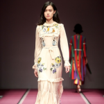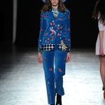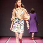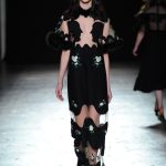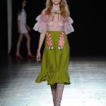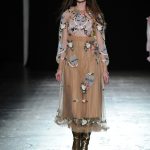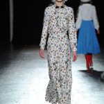 La natura entra in scena, ma non come la conosciamo, e le stampe floreali mutano in collage di elementi botanici che creano preziosi ricami. Da lontano, sembrerebbero gambi e corolle; da vicino, si rivelano innesti surrealisti di bacche, verdure, frutti e piante erbacee. Rose gialle sono infatti pomodori, file di perle fungono da semi racchiusi in verdi baccelli, i petali si scoprono ali di farfalla: la logica è sfidata, l’immaginazione liberata.