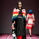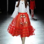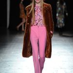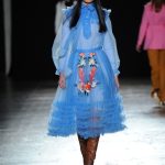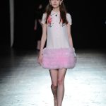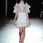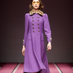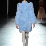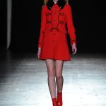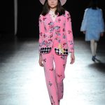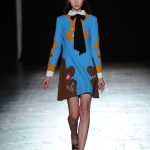 Guardando a un futuro informato dal passato, Vivetta rilegge i suoi codici per aprire nuove prospettive. Il Collo Mani diventa una sciarpa che avvolge la scollatura; il trompe-l’œil si fa audace, sovrapponendo cappotti e cappottini, abiti e abitini con illusioni ottiche, cromatiche e dimensionali. Se la silhouette anni ’60 à la Vivetta è vista attraverso il prisma del contemporaneo, il tailoring, le cravatte Regimental e i capi romantici sembrano oggi volanti grazie ai tagli curvi e ai volumi sospesi di un’anima che ha memoria. Studiati, spostati, ripensati e moltiplicati sono invece gli archetipi del guardaroba, dal colletto della camicia ai fiocchi simbolo di femminilità: l’interpretazione del classico è sempre un serio divertissement. Anche la variazione di scala è un campo di sperimentazione, tra vestibilità slim e oversize, così come le incursioni tecniche, con il cappuccio sportswear che corona garbatamente il viso di arricciature.