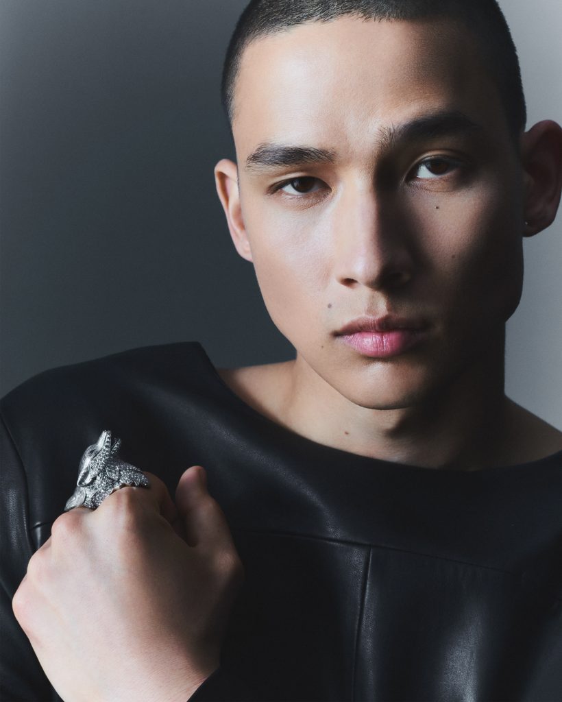 Quinto capitolo ci porta nelle viscere della Terra, esplorando il potere magmatico di un mondo estremo in cui il bianco incontra il nero. La struttura di una conchiglia vista ai raggi X è aerografata sugli elementi in madreperla della collana in oro bianco Coquillage (Conchiglia). Il motivo aerografato dona alla collana un’illusione di tridimensionalità proveniente da un“altrove”. Il legno bruciato incontra le linee pulite della collana quasi minimalista Bois Brûlé Diamant (Legno bruciato di Diamante). Questo rovere di torbiera di oltre tremila anni è stato bruciato secondo la tecnica giapponese “Chou Sugi Ban”, che gli conferisce una straordinaria resilienza. La giustapposizione ai diamanti rivela un contrasto potente e inaspettato tra materiali che si immaginerebbero contraddittori tra di loro. L’anello Loup (Lupo) raffigura un lupo, che ulula alla luna mentre girovaga per il mondo di Volcano Man. Un animale protettivo e aggregante, il cui realismo è ravvivato da meteorite, diamanti, oro bianco, platino e onice. L’orecchino singolo Octopus, progettato come un punto di incontro tra tatuaggio e creatura marina, adorna la testa con i suoi arabeschi di oro bianco, esaltati da 178 placchette di madreperla e 443 diamanti taglio brillante.