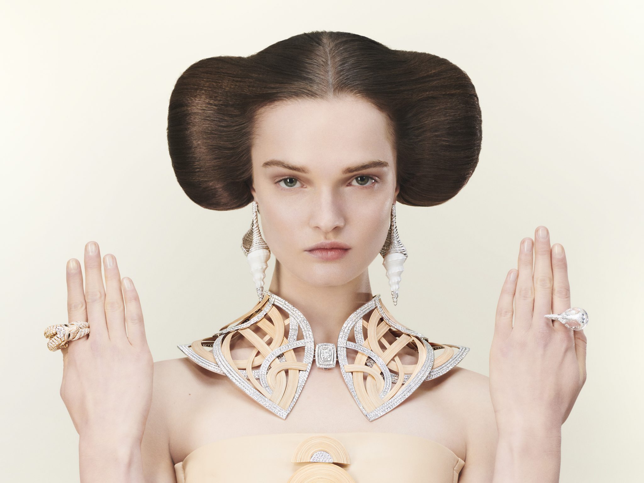 Sulla collana Rotin Diamant (Rattan di Diamante), la fibra naturale di rattan è stata inumidita e poi asciugata su un supporto di ottone, e vi è stata inserita una barretta d’oro perché mantenesse la forma finale. L’alta gioielleria, tradizionalmente, dona morbidezza ai materiali duri, come metalli epietre; qui invece, l’arte irrigidisce un materiale naturalmente morbido, in modo da creare questa spettacolare giustapposizione di rattan e diamanti.Una spilla in stile Art Déco che si trasforma in una collana, che associa il rattan a 379 diamanti in taglio brillante e all’oro, sia giallo che rosa. Da questo arido paesaggio emergono degli animali immaginari: un maestoso anello Gazelle, al contempo morbido e possente. La tenerezza dei suoi occhi di onice contrasta col vigore delle sue corna, tempestate di diamanti taglio baguette. Un diamante da 2,15 carati brilla in tutto il suo splendore sulla fronte. L’anello Pie (Gazza) è stato una vera sfida: forare un blocco di cristallo di rocca prima di inserire un teschio di oro bianco con diamanti. Oltre a questi animali immaginari, la coppia di orecchini Coquillage Diamant (Conchiglia di Diamante) completa il set Sand Woman. Per crearli, sono state selezionate e scansionate delle conchiglie naturali, delle quali è stata poi ricreata la trama, la curva e la forma in oro e diamanti. Il risultato fonde la conchiglia naturale con oro e diamanti in una modalità completamente inedita, che mette in discussione il significato della parola “prezioso”.
