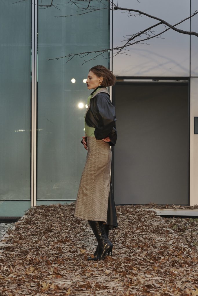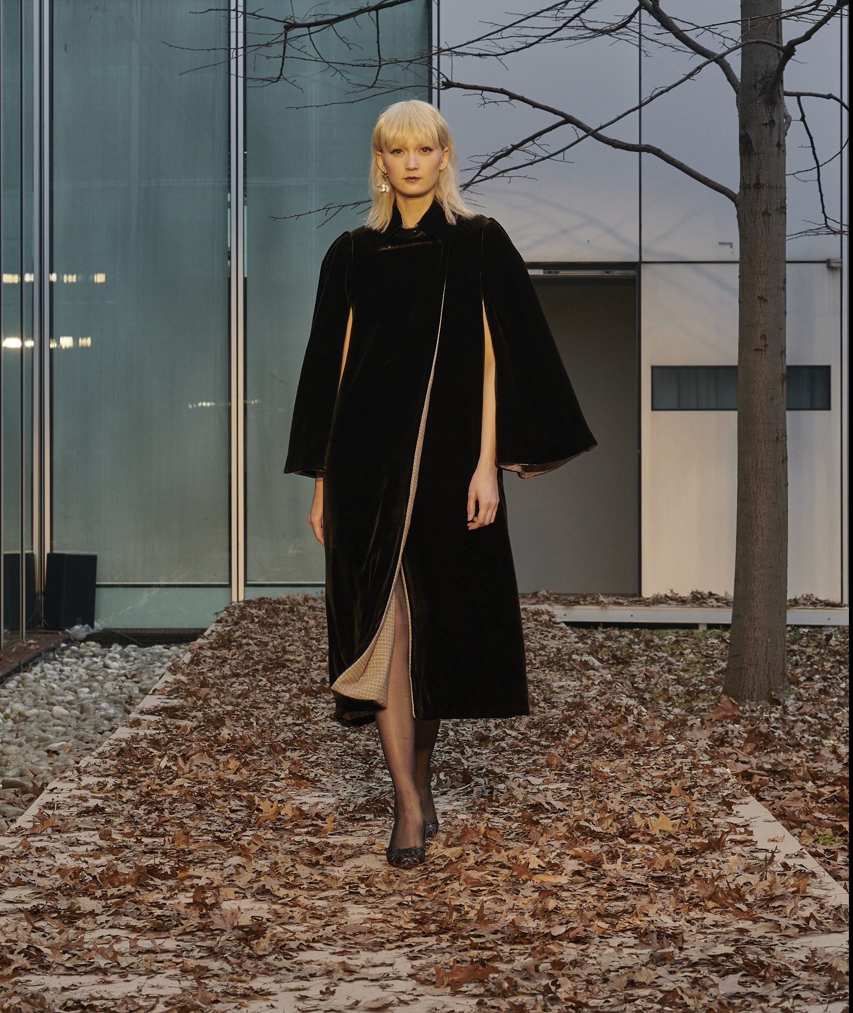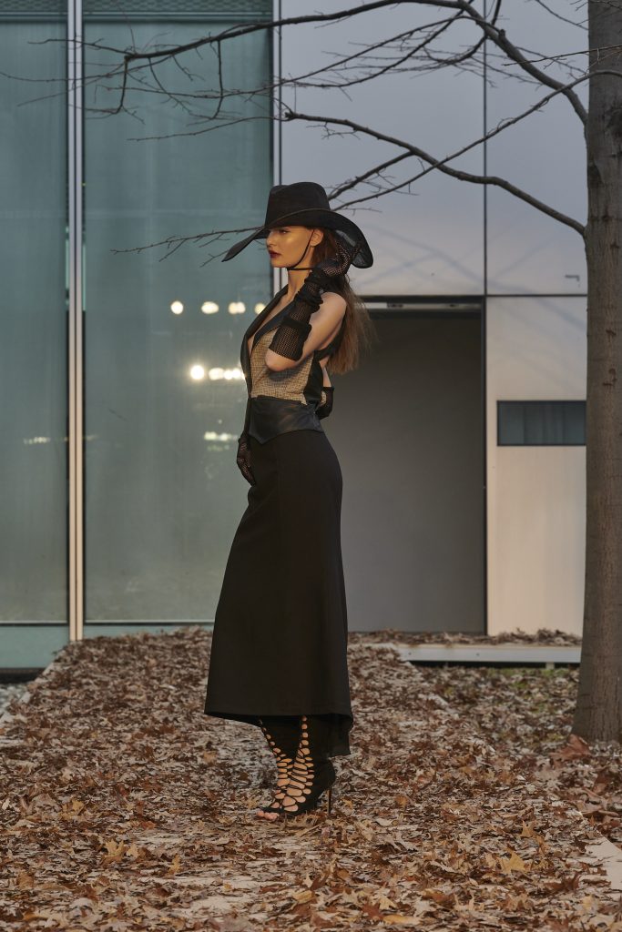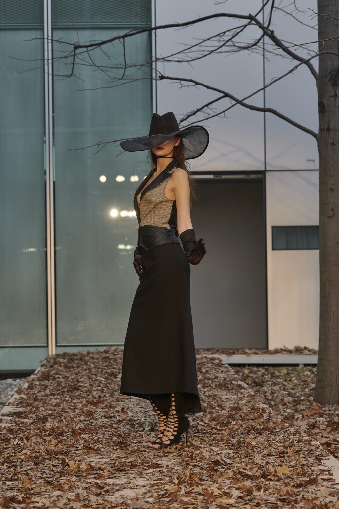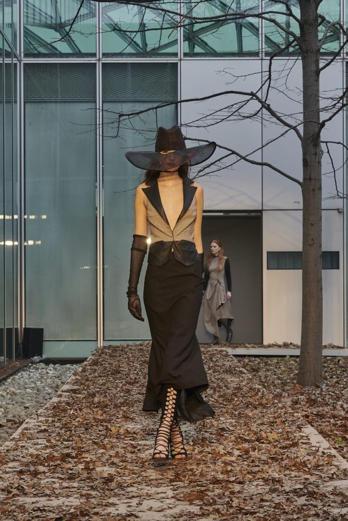 Code in pelle si staccano da gonne in pied de poule color nero e cognac. Un occhio di donna scruta, attraverso un inaspettato cappello, un completo sartoriale con giacca con plastron interno e pantaloni da uomo, un intarsio che crea sagome di buio in pelle e proporzioni che sembrano uscire dall’ombra. Completa il look della collezione l’erotica e rigorosa mantella con apertura a corsetto lungo la schiena, in velluto di seta o in tartan di lana accoppiati alla seduzione di un raso in seta color ghiaccio, in una rigorosa lavorazione double face.