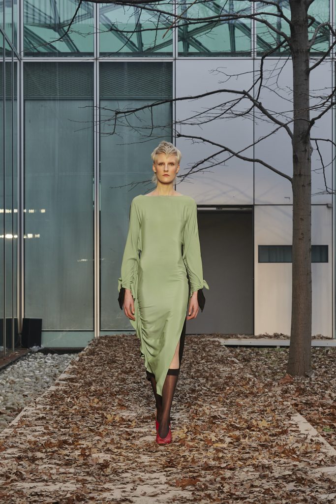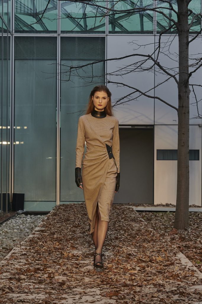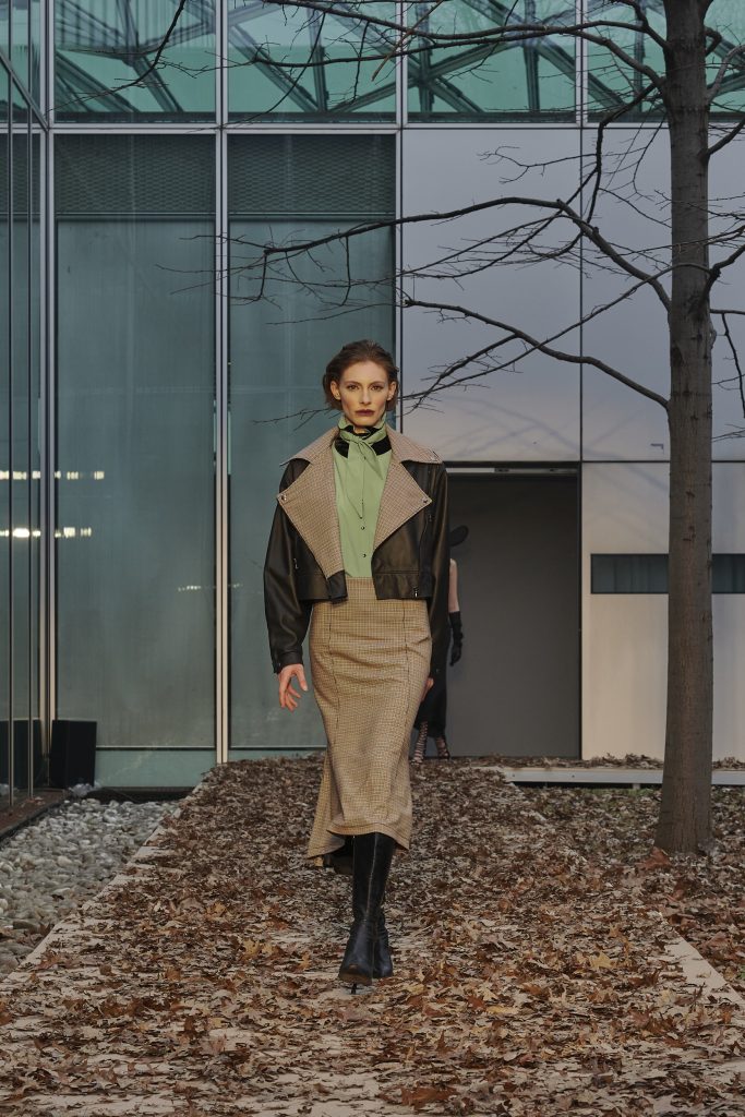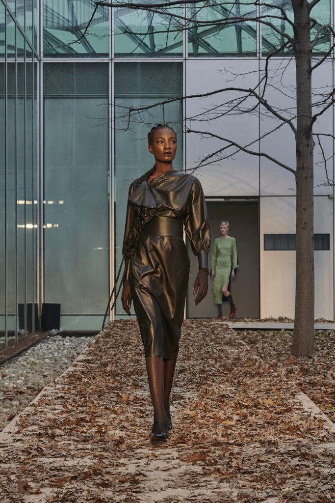 Tutto ciò ha trovato vita in una dicotomia di natura e touch industriale che ha caratterizzato i due eventi del designer durante la Fashion Week. Il primo in piazza Tomasi di Lampedusa e più precisamente “in quel rettangolo fatto di vetro, pareti rivestite in pelle cognac e cemento graffite, bordi in ottone e specchi”, che lo Spazio Lineapelle rappresenta. Il secondo in un luogo metafisico, connotato da suggestioni sensuali e cinematografiche: il giardino racchiuso ancora una volta da vetrate presso il Centro Servizi Fiera Milano Rho, dove le modelle hanno sfilato dando vita ad atmosfere surreali.