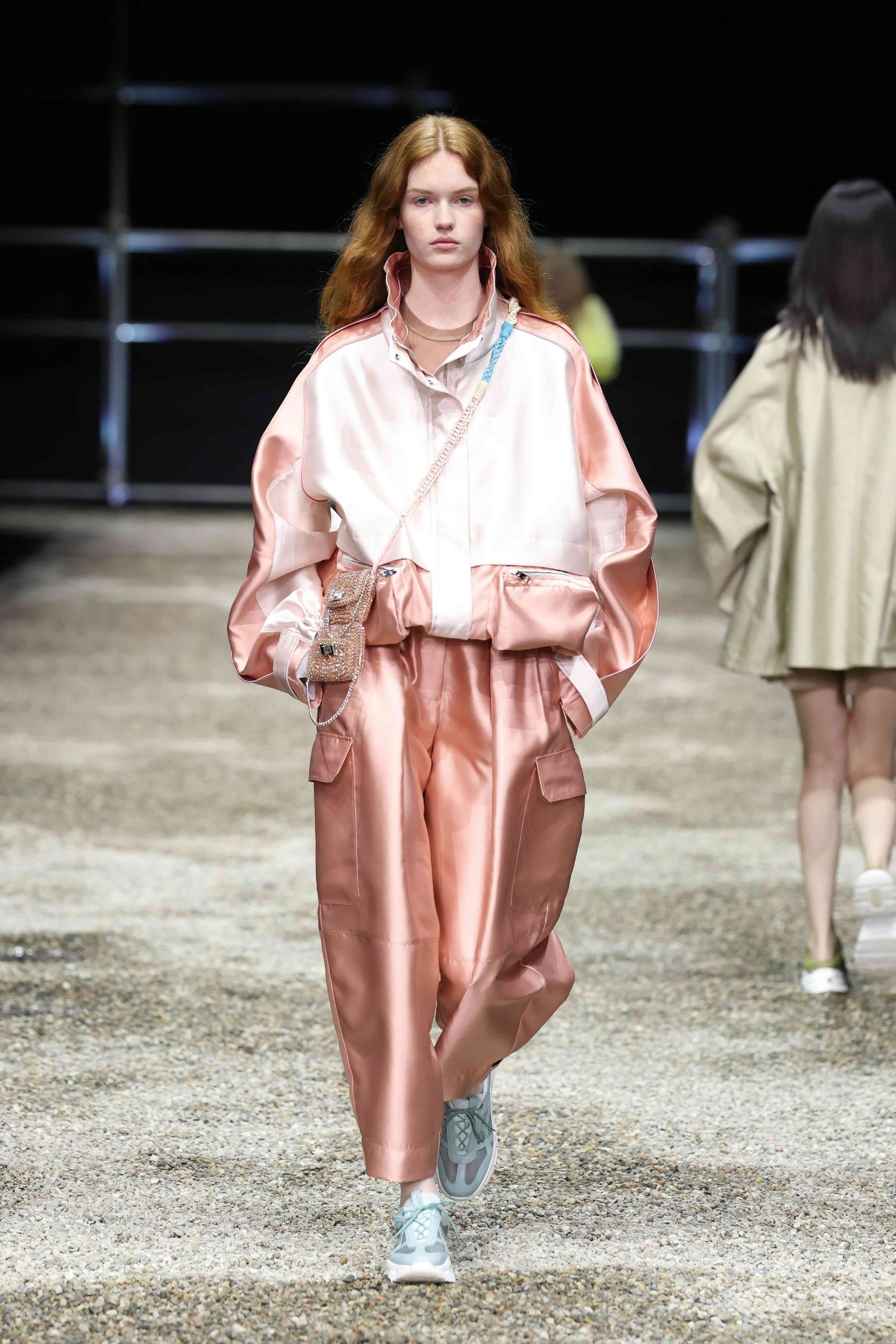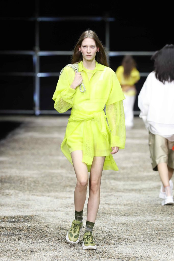 Il brand diretto da Izumi Ogino ha infatti trasformato la sfilata in un laboratorio a cielo aperto. Impalcature, ghiaia, pozze d’acqua: elementi che solitamente appartengono alla quotidianità urbana diventano qui scenografia e, soprattutto, dichiarazione.