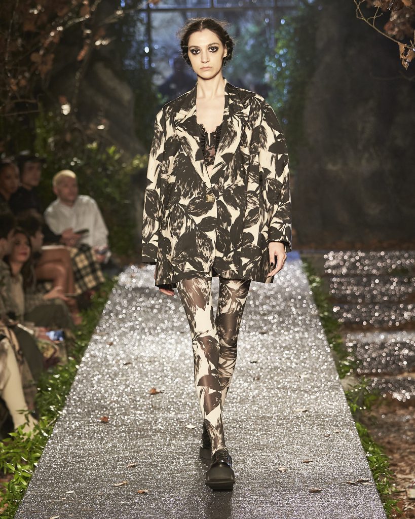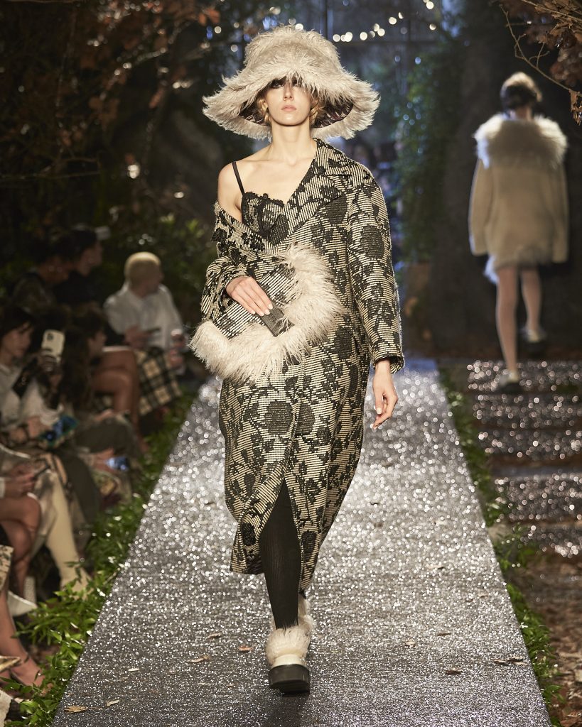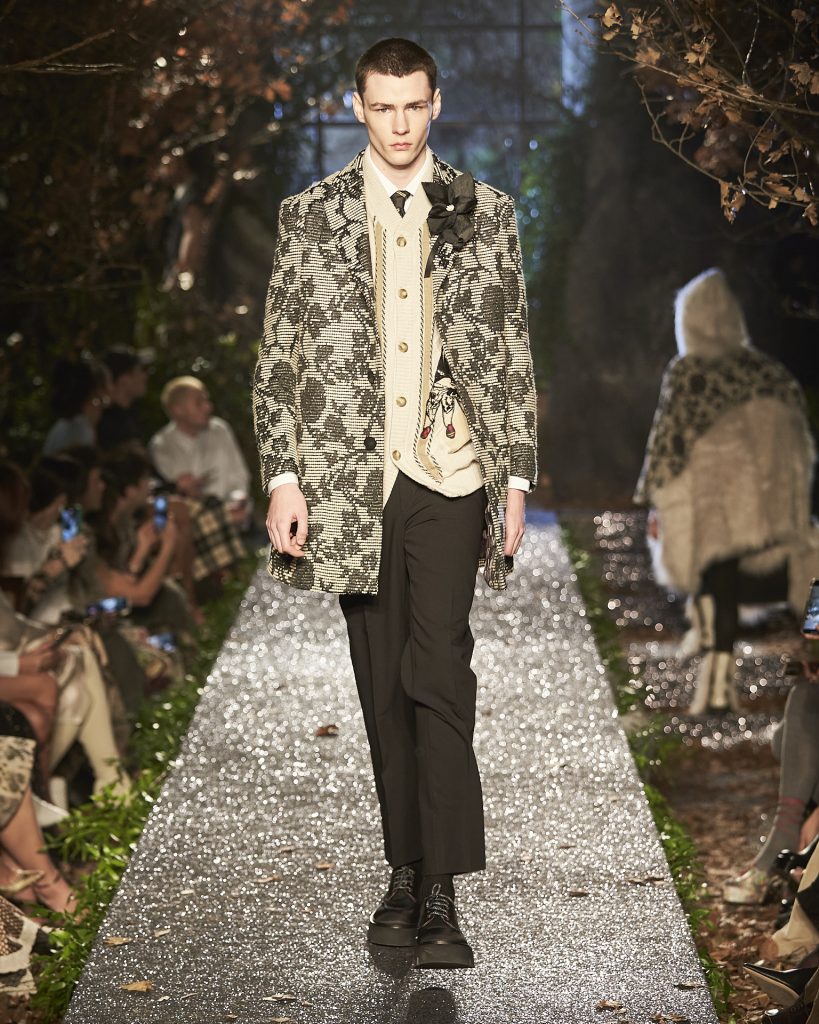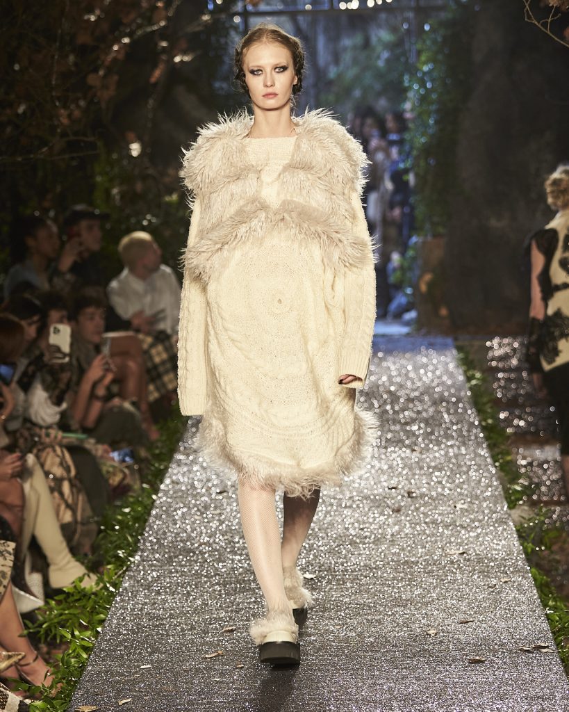 interrotti e intarsiati. Tartan e tulle floccato, paillettes e stuoie, jersey goffrato, pelliccia fake e matelassè e soprattutto fiori. Velluto pannè traforato e panni cangianti, lana agugliata e incastrata con il tessuto. Stampe di foglie a cascata, grandi rose vaganti, motivi geometrici e foto ritratto del migliore amico dell’uomo. Maglie pettinate a motivi jacquard tipici della tradizione tessile sarda, maglie avvolgenti in cashmere e maglie ritrovate, tagliate e ricostruite incastrate con ricami macramè, pizzi e plissèe. Jacquard fil coupè, twill di seta e felpe.
