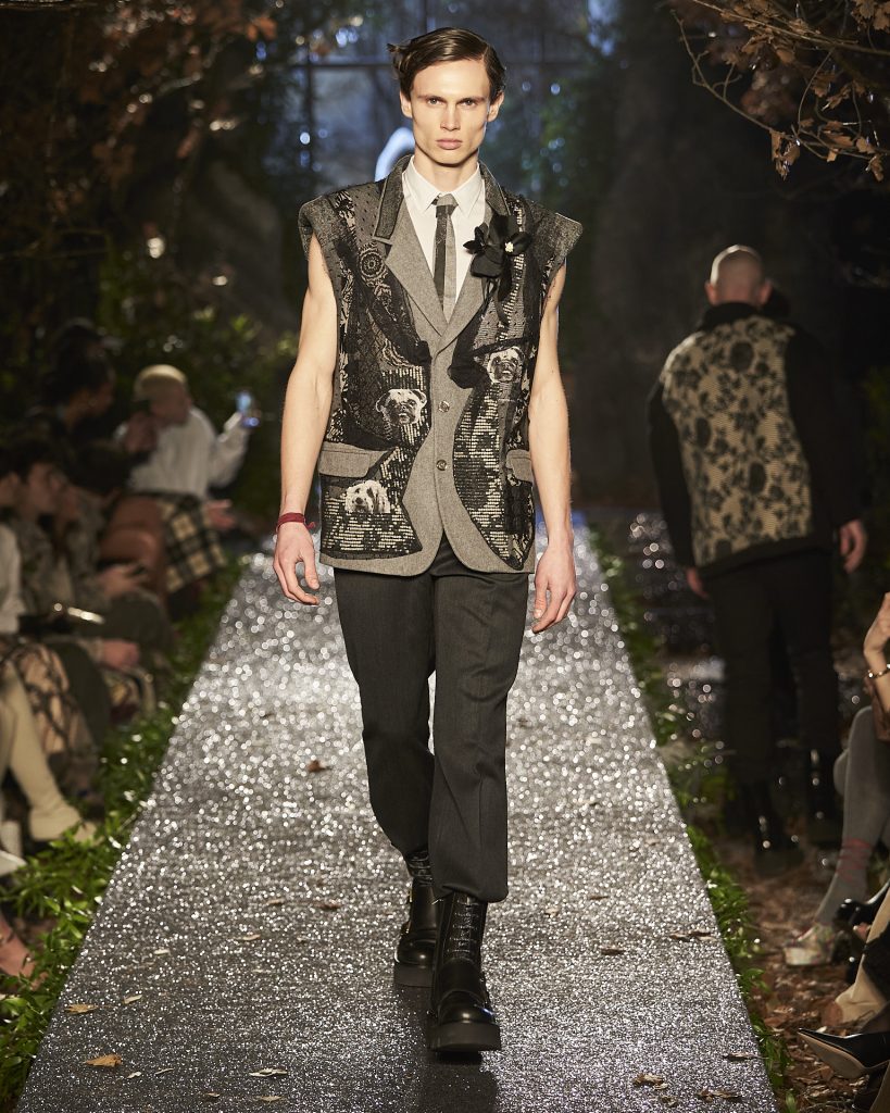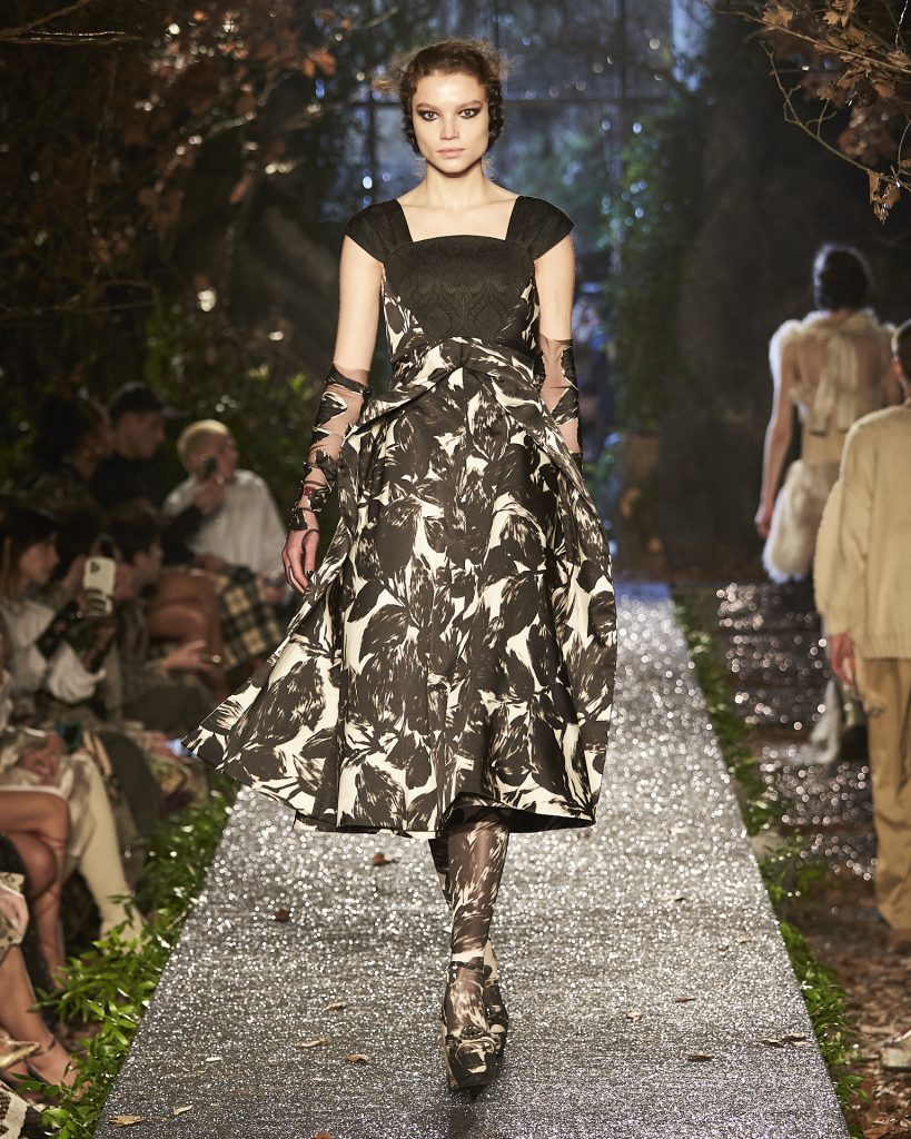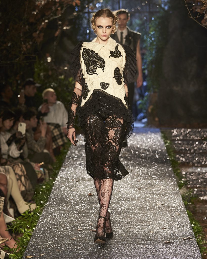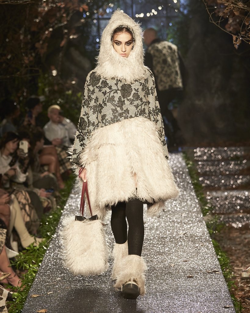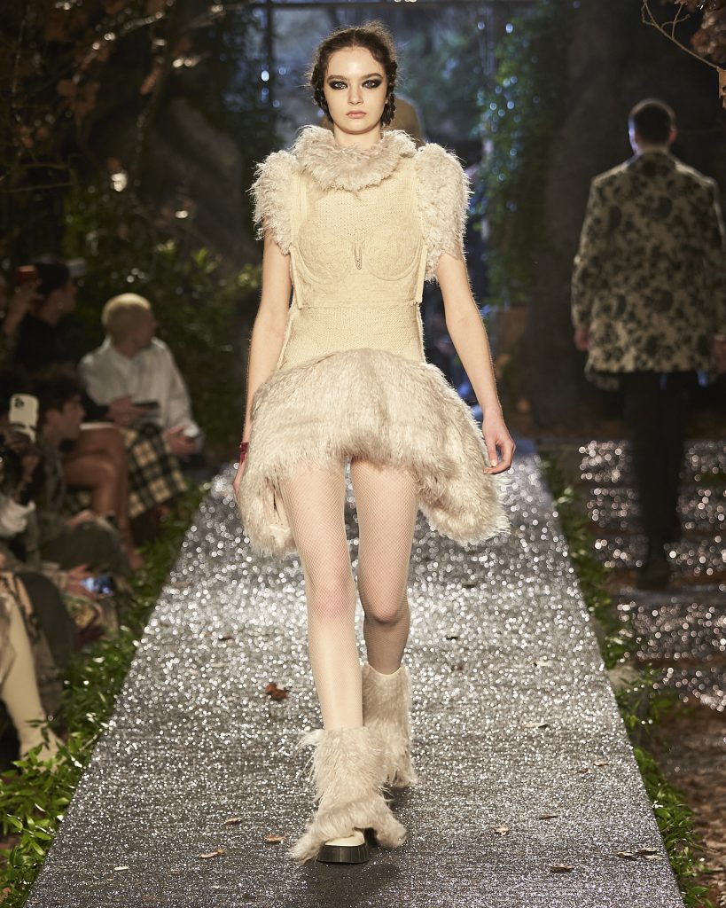 interrotti e intarsiati. Tartan e tulle floccato, paillettes e stuoie, jersey goffrato, pelliccia fake e matelassè e soprattutto fiori. Velluto pannè traforato e panni cangianti, lana agugliata e incastrata con il tessuto. Stampe di foglie a cascata, grandi rose vaganti, motivi geometrici e foto ritratto del migliore amico dell’uomo. Maglie pettinate a motivi jacquard tipici della tradizione tessile sarda, maglie avvolgenti in cashmere e maglie ritrovate, tagliate e ricostruite incastrate con ricami macramè, pizzi e plissèe. Jacquard fil coupè, twill di seta e felpe.