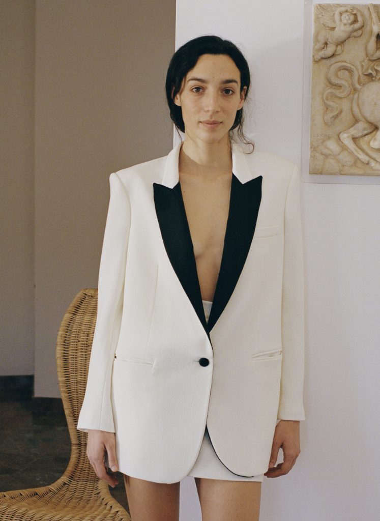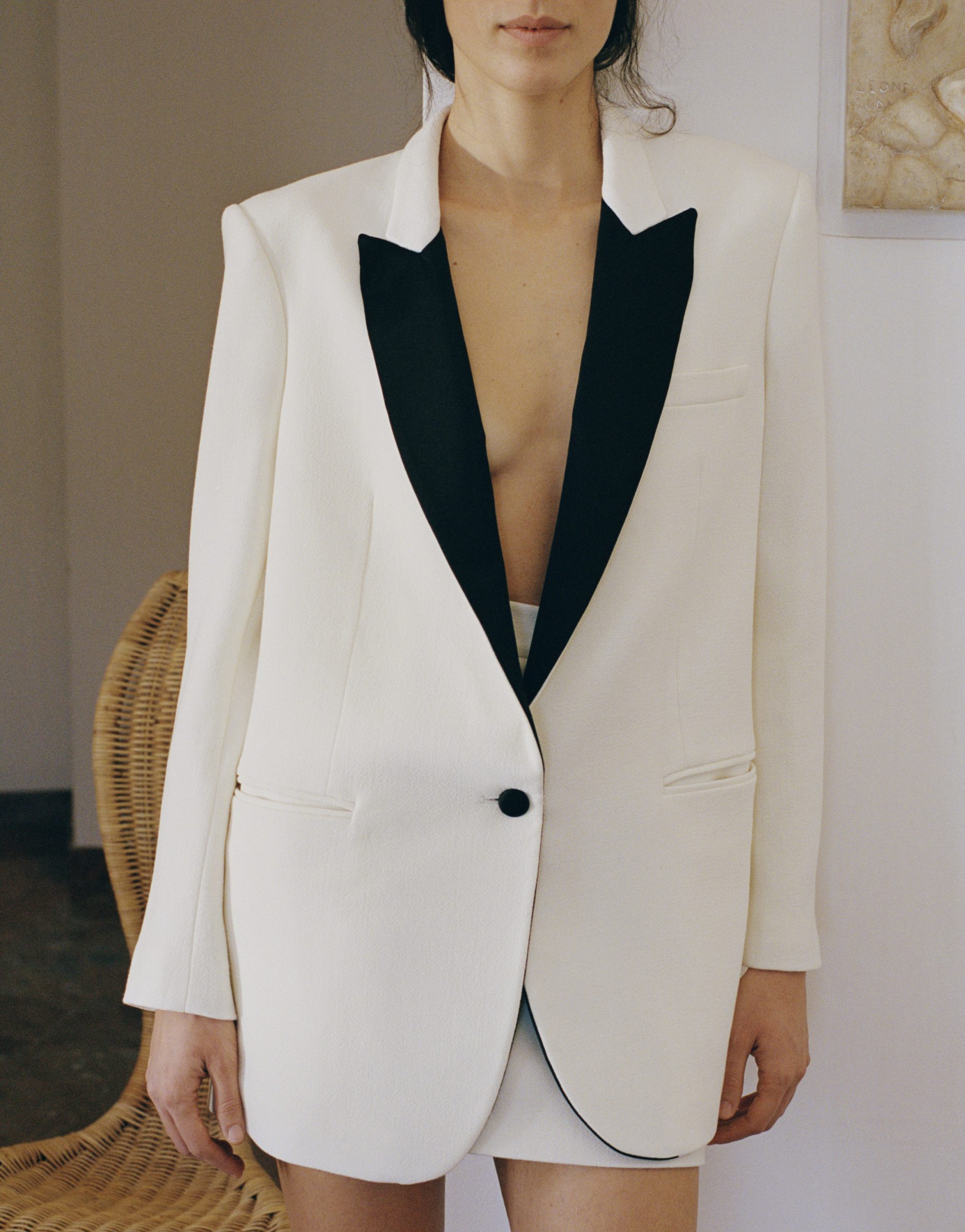 Il bianco ottico del completo è impreziosito da dettagli in raso nero a contrasto, come i revers e i bottoni.