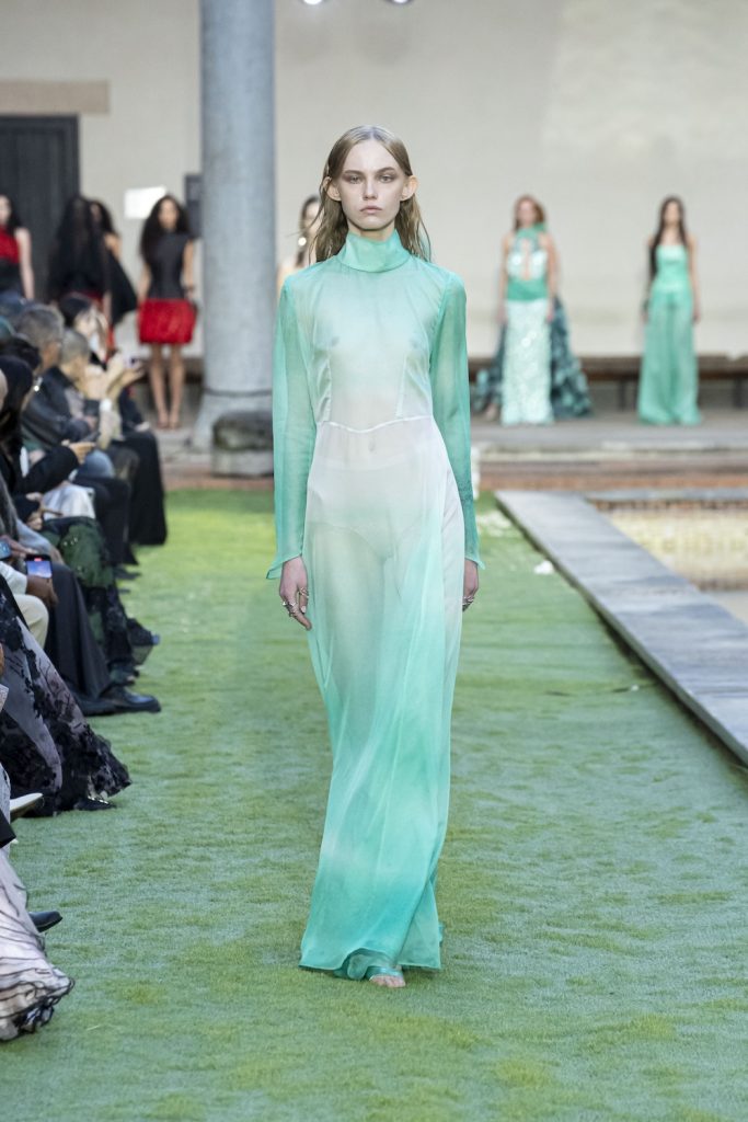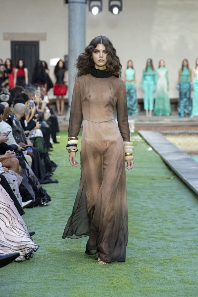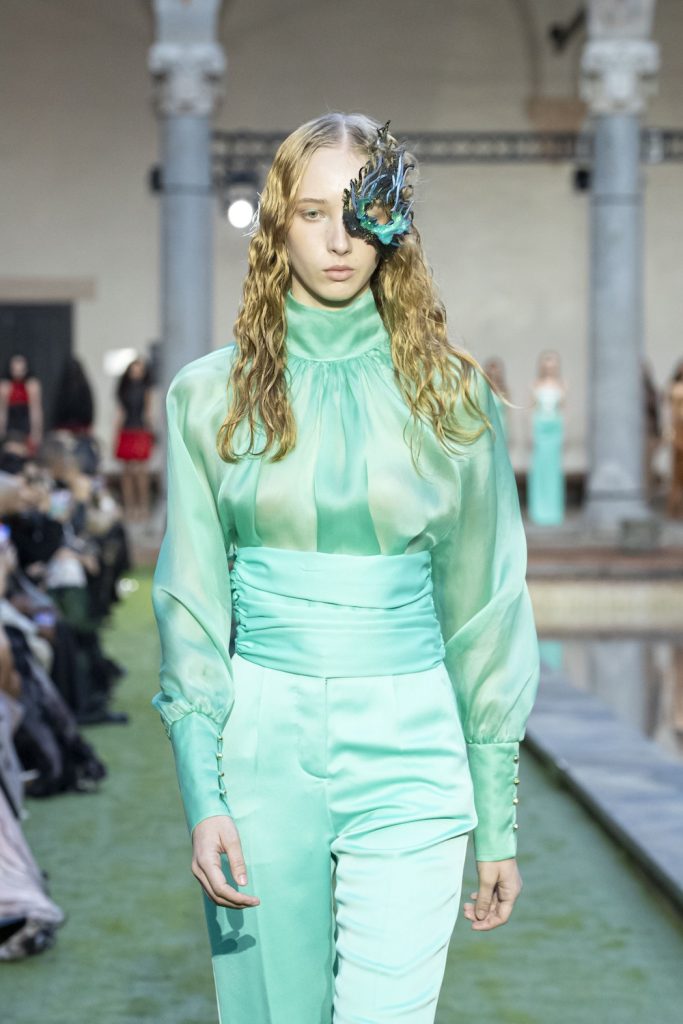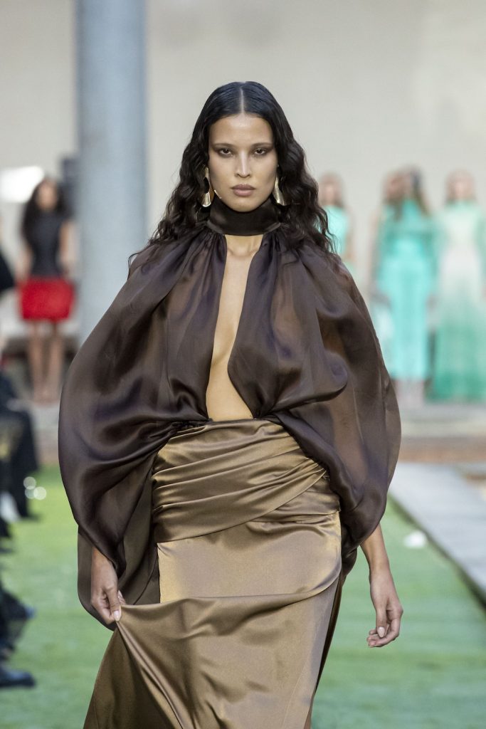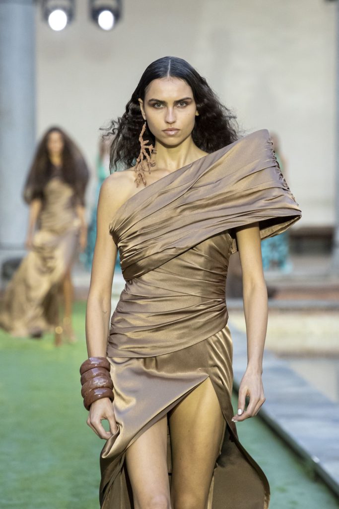 La materia è il veicolo di questo racconto: broccato e seta con la loro gravitas evocano rituali antichi e un’eco quasi esoterica; chiffon e organza si muovono nell’aria come fumo o spiriti leggeri; crêpe e cady costruiscono silhouette che oscillano tra scultura e movimento, trasformando il corpo in un’armatura fluida, mai rigida. La palette cromatica non è un mero esercizio di stile, ma un codice simbolico: argento lunare e bianco come visioni chiaroveggenti, oro come sacralità, marrone e sabbia come radicamento, verde mare come profondità, rosso come passione e forza femminile, nero come protezione e mistero.