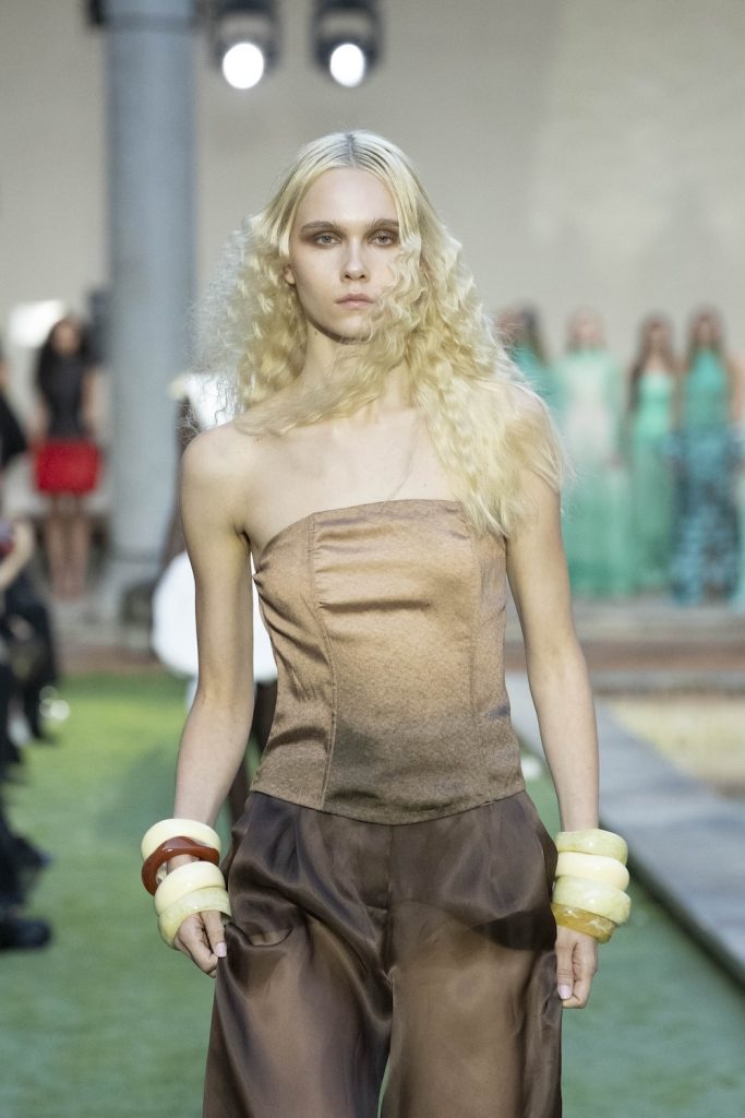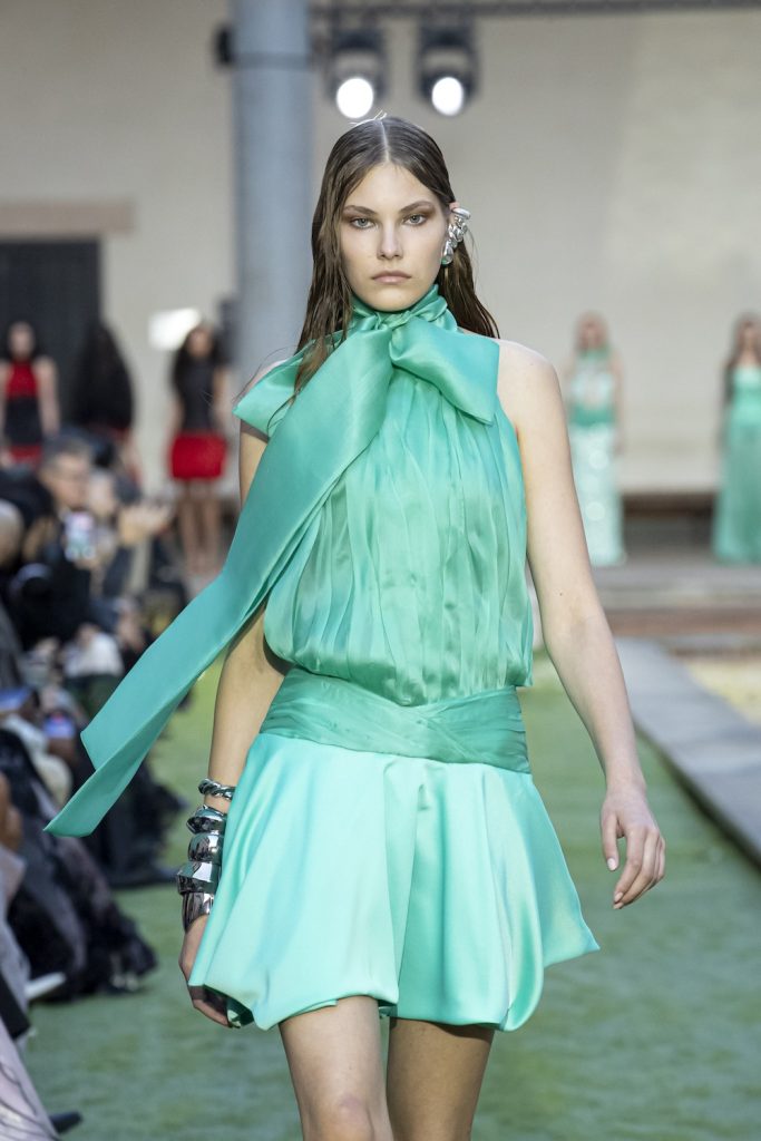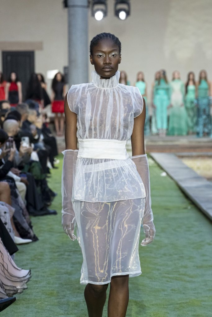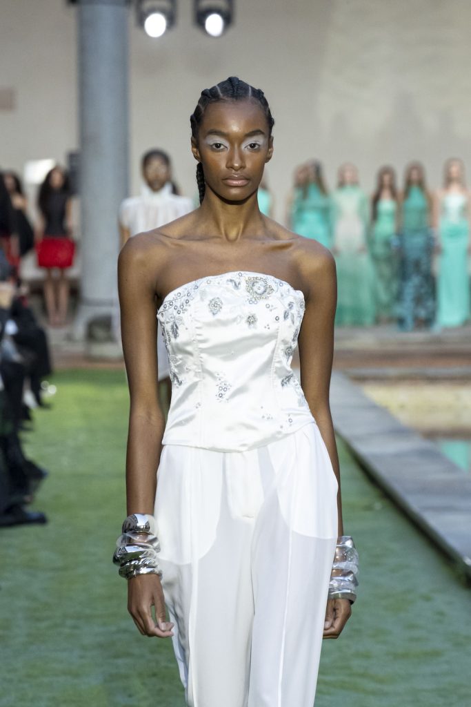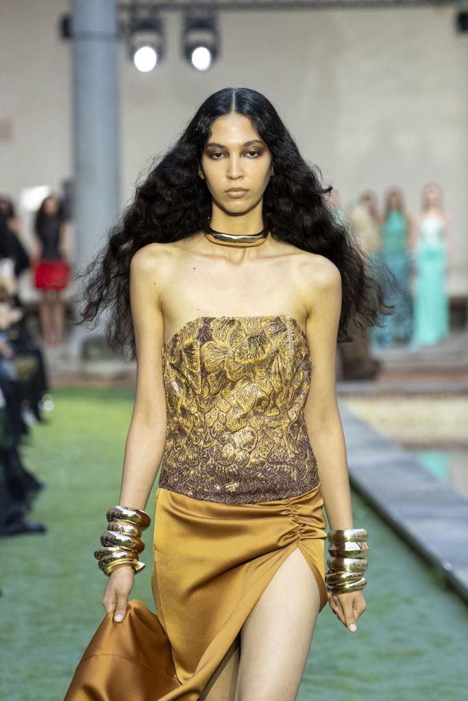 La materia è il veicolo di questo racconto: broccato e seta con la loro gravitas evocano rituali antichi e un’eco quasi esoterica; chiffon e organza si muovono nell’aria come fumo o spiriti leggeri; crêpe e cady costruiscono silhouette che oscillano tra scultura e movimento, trasformando il corpo in un’armatura fluida, mai rigida. La palette cromatica non è un mero esercizio di stile, ma un codice simbolico: argento lunare e bianco come visioni chiaroveggenti, oro come sacralità, marrone e sabbia come radicamento, verde mare come profondità, rosso come passione e forza femminile, nero come protezione e mistero.