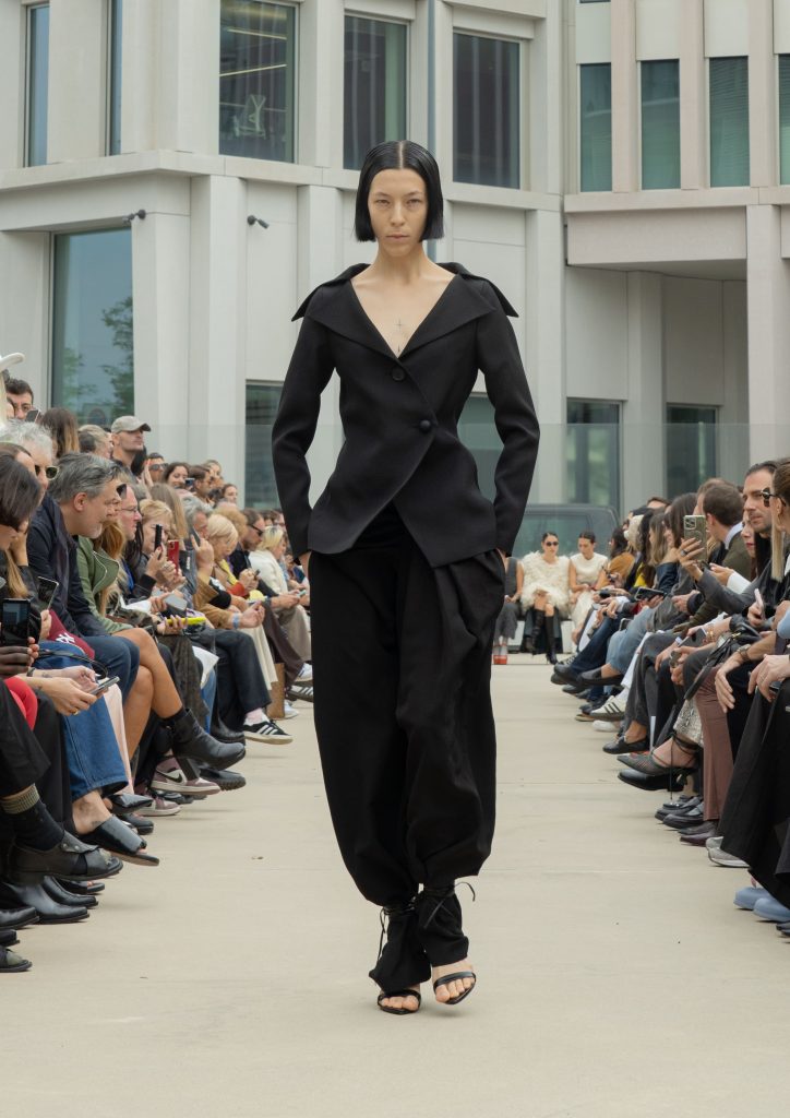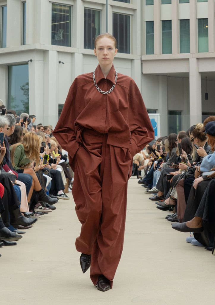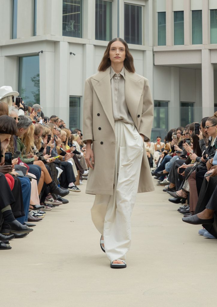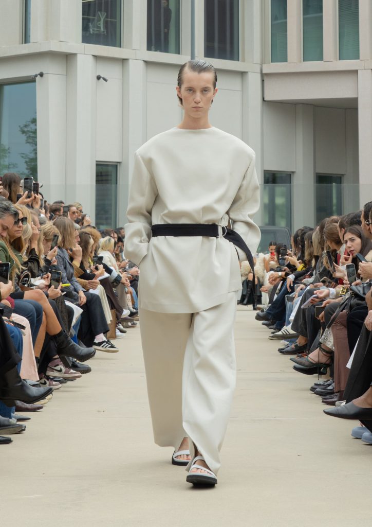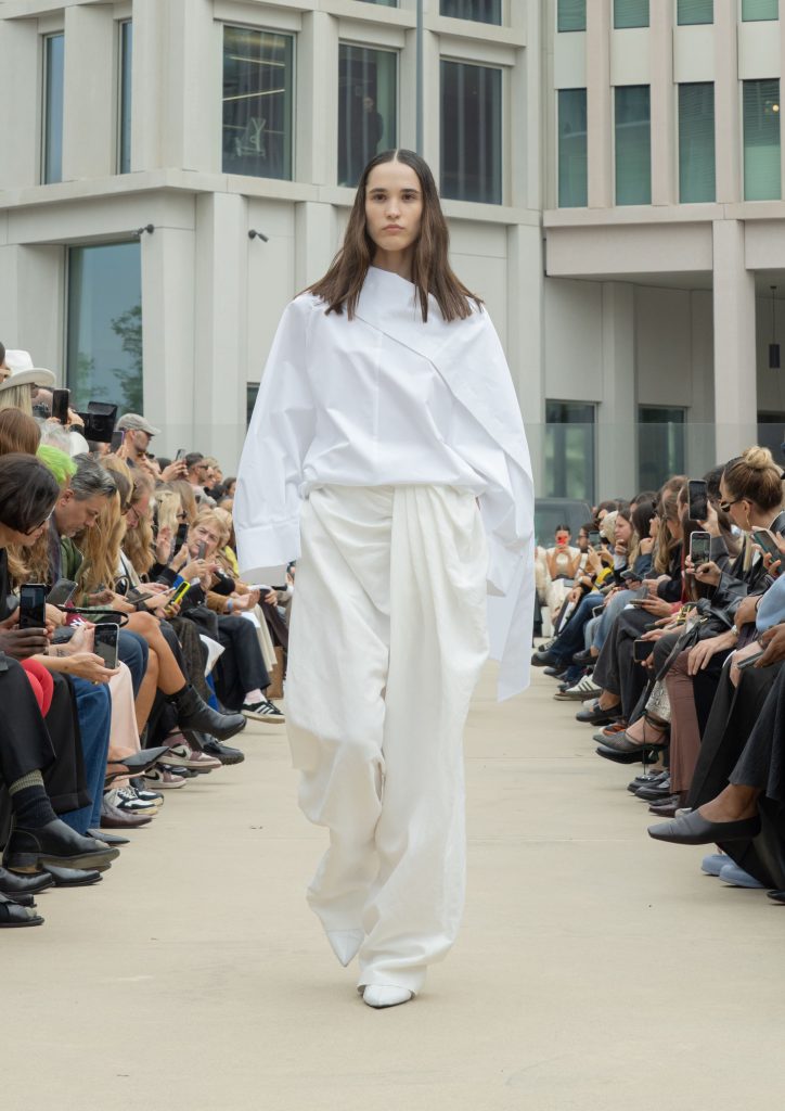 Il tema della leggerezza, della brezza sul viso, corre in tutta la collezione, attraverso i volumi che si fanno più avvolgenti e protettivi, disegnando un nuovo ecosistema che cerca, come sempre nell’estetica di CALCATERRA, di rinascere allontanandoci dalla quotidianità del nostro tempo. È così che anche il pantalone perde il suo tailoring, abbandonando