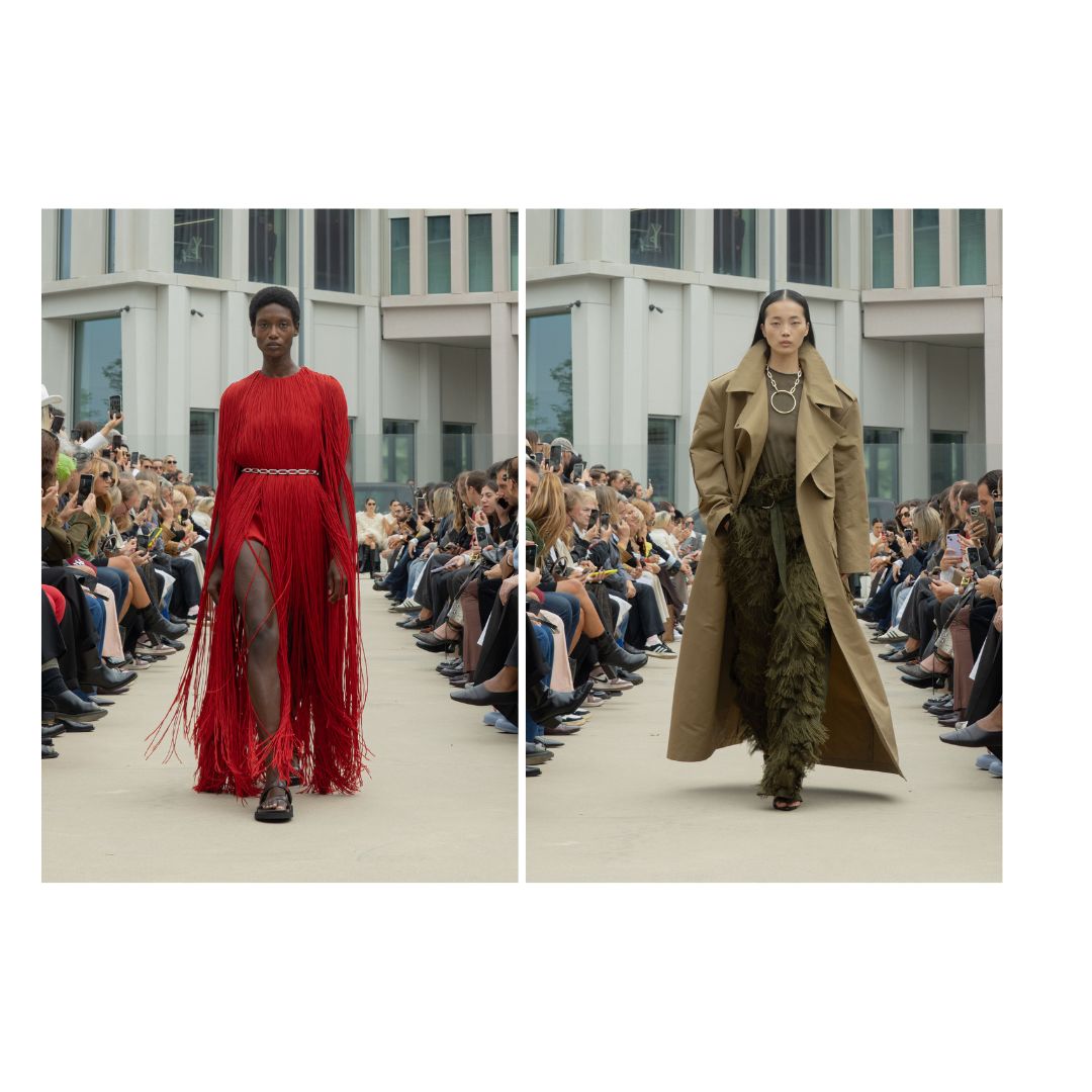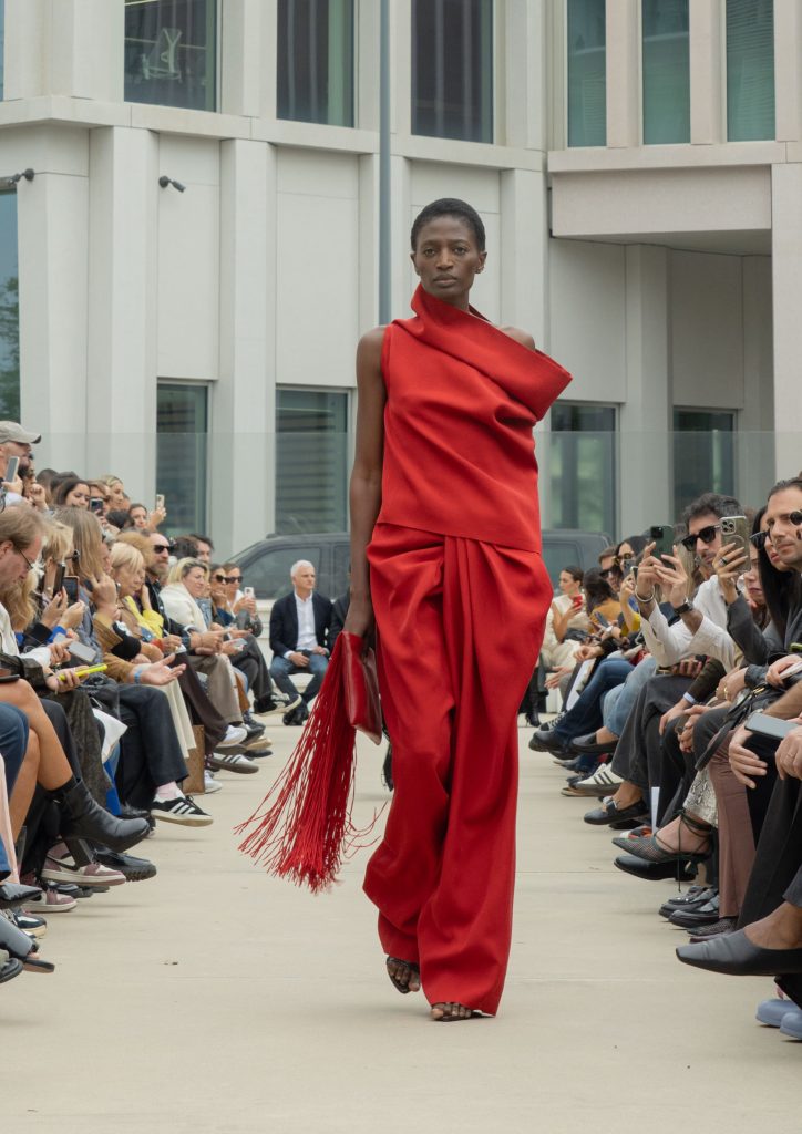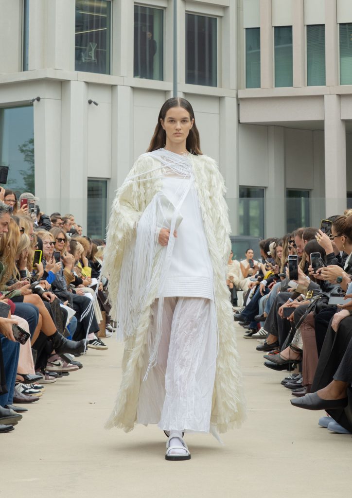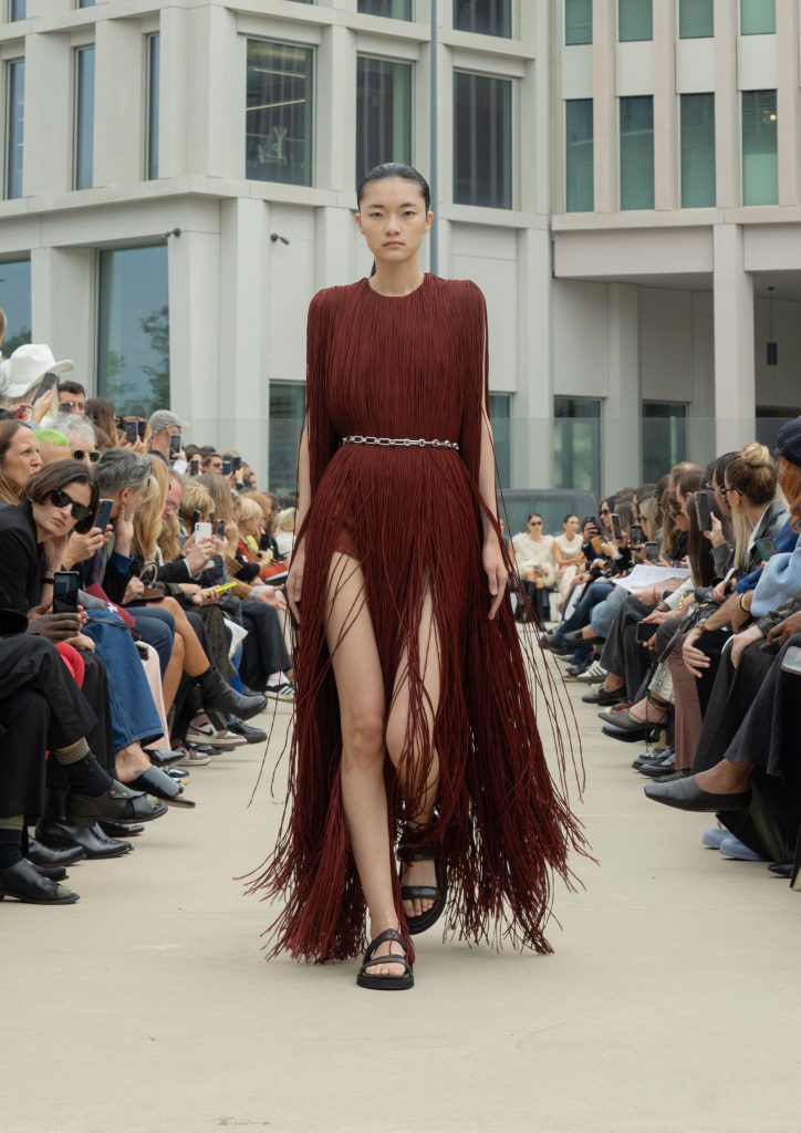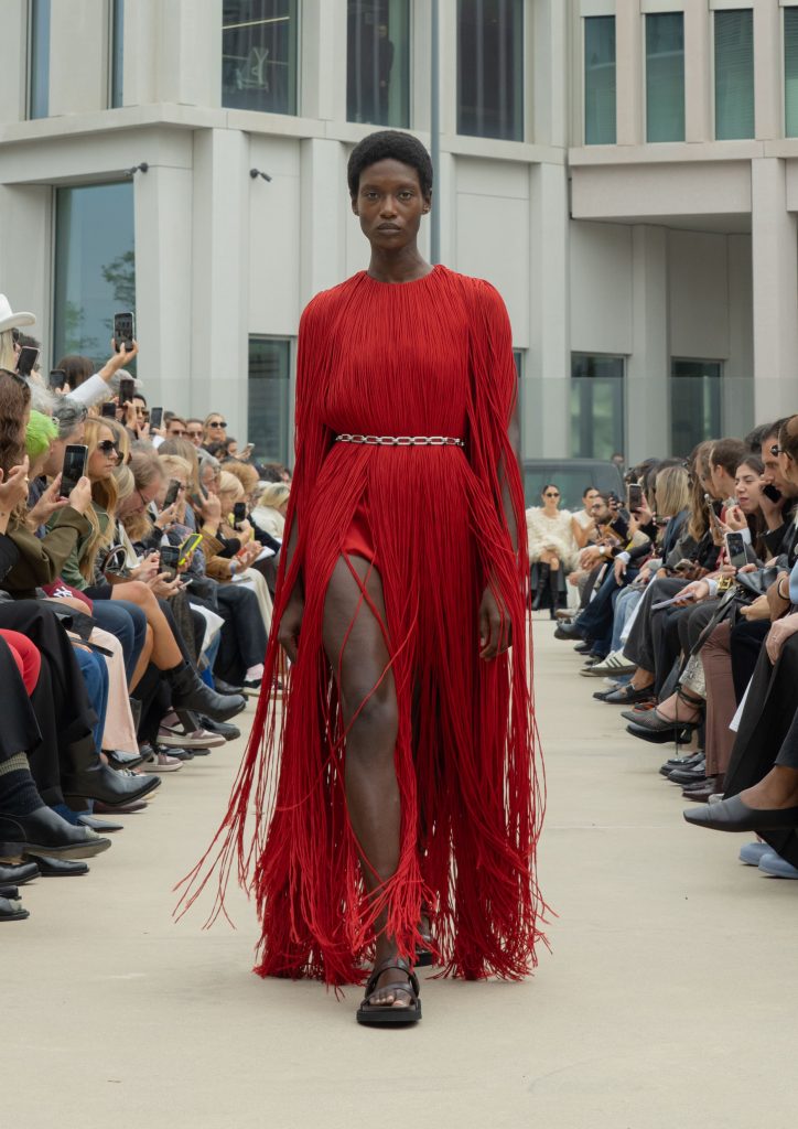 L’elemento naturale attraversa l’intera collezione, in una lettura trasversale di tessuti e colori: sete organzate, cotoni tinti a freddo e fil coupé mimano i movimenti vitali di foglie al vento o i colori di intensi tramonti, come per l’abito rosso sanguigno, reso leggero da una cascata di frange in chiffon di seta intrecciato a mano che diventa uno dei motivi ricorrenti della stagione.