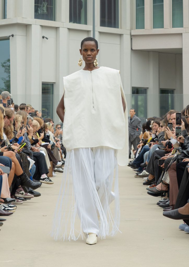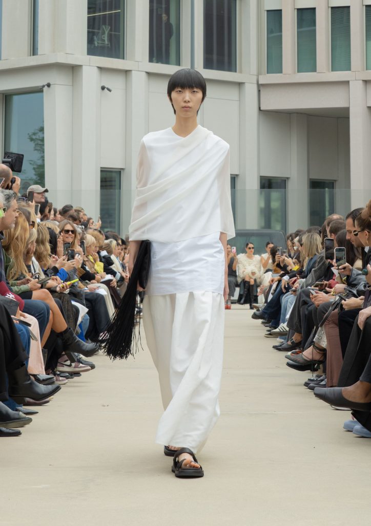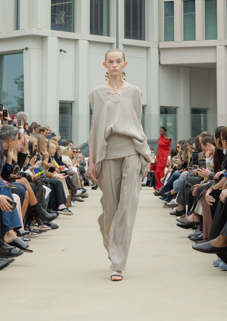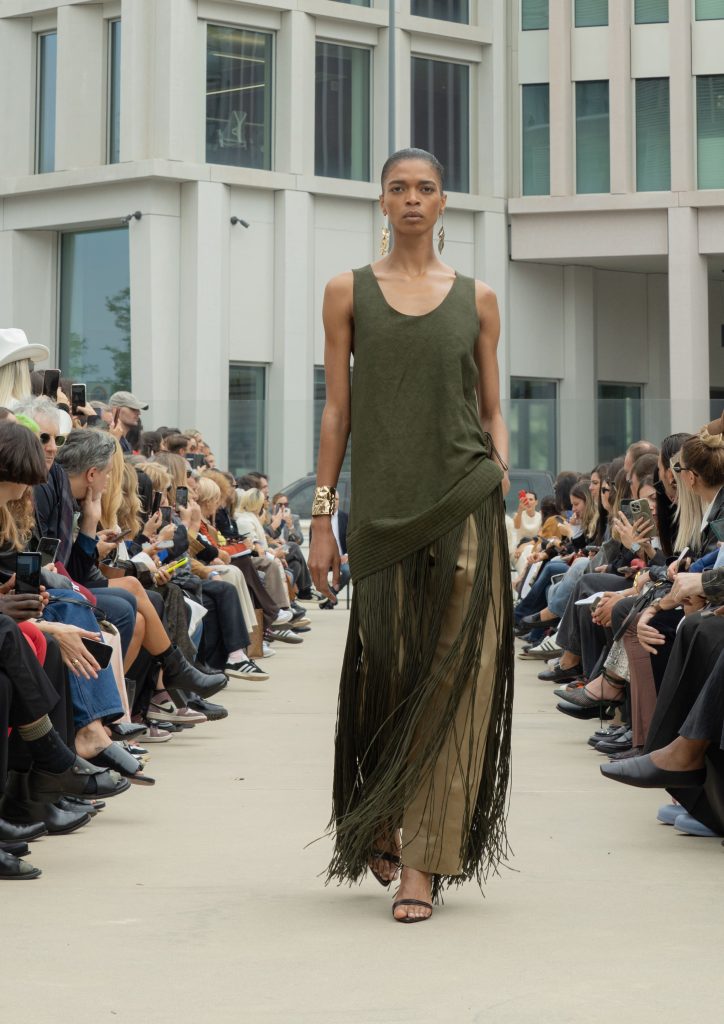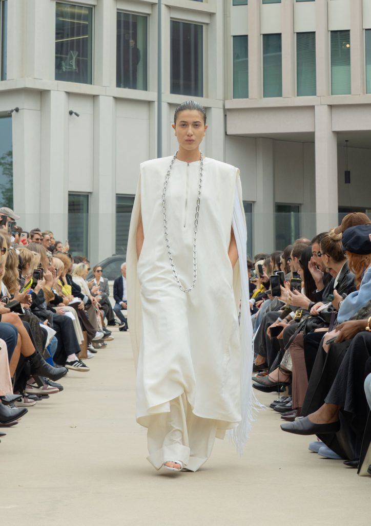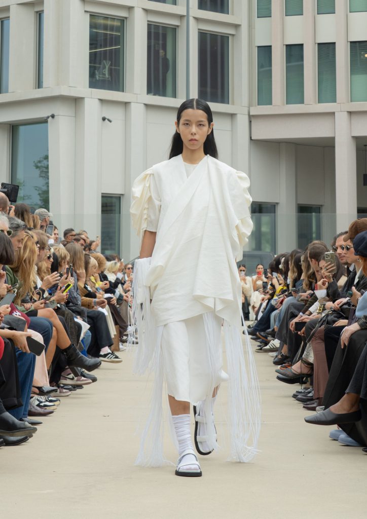 L’elemento naturale attraversa l’intera collezione, in una lettura trasversale di tessuti e colori: sete organzate, cotoni tinti a freddo e fil coupé mimano i movimenti vitali di foglie al vento o i colori di intensi tramonti, come per l’abito rosso sanguigno, reso leggero da una cascata di frange in chiffon di seta intrecciato a mano che diventa uno dei motivi ricorrenti della stagione.