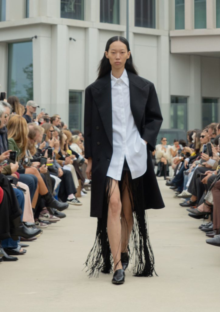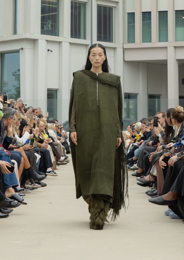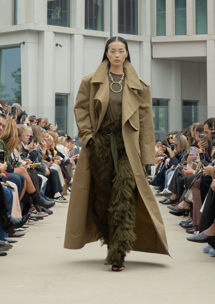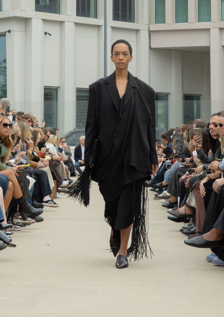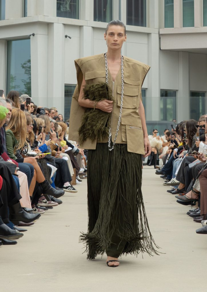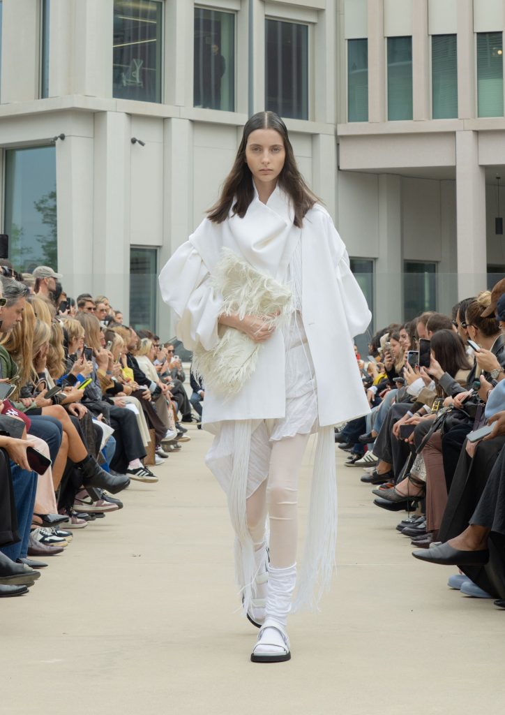 L’elemento naturale attraversa l’intera collezione, in una lettura trasversale di tessuti e colori: sete organzate, cotoni tinti a freddo e fil coupé mimano i movimenti vitali di foglie al vento o i colori di intensi tramonti, come per l’abito rosso sanguigno, reso leggero da una cascata di frange in chiffon di seta intrecciato a mano che diventa uno dei motivi ricorrenti della stagione.