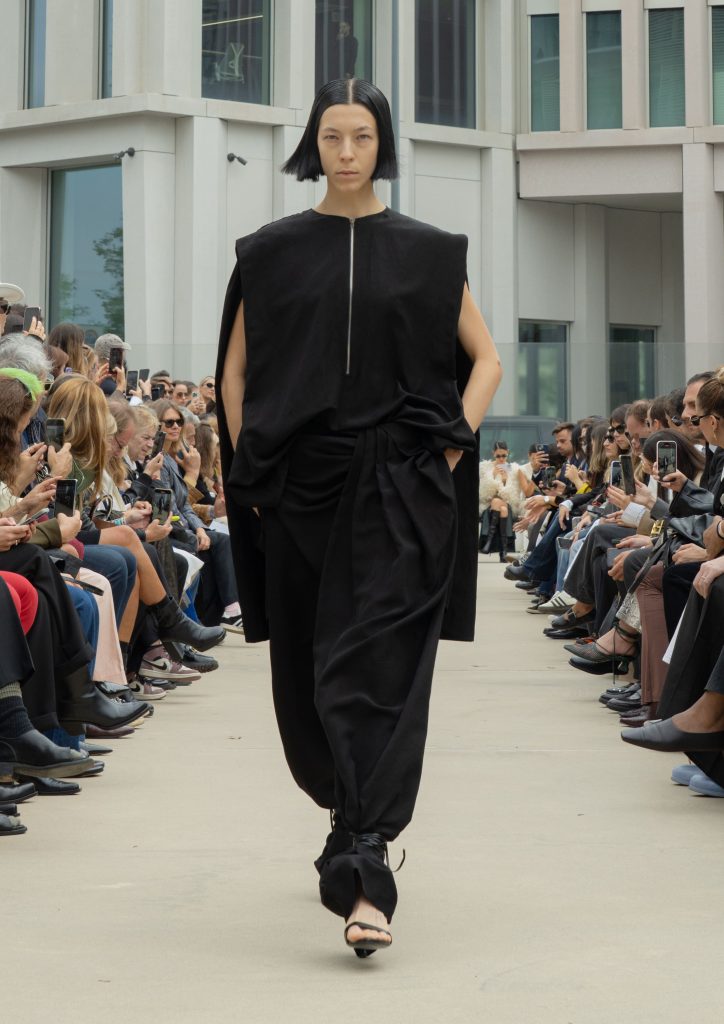 tasche e cuciture per trasformarsi in un drappeggio naturale – che ricorda la prima Josephine Baker – attraverso tessuti che sembrano nascere sul corpo, come un’onda.