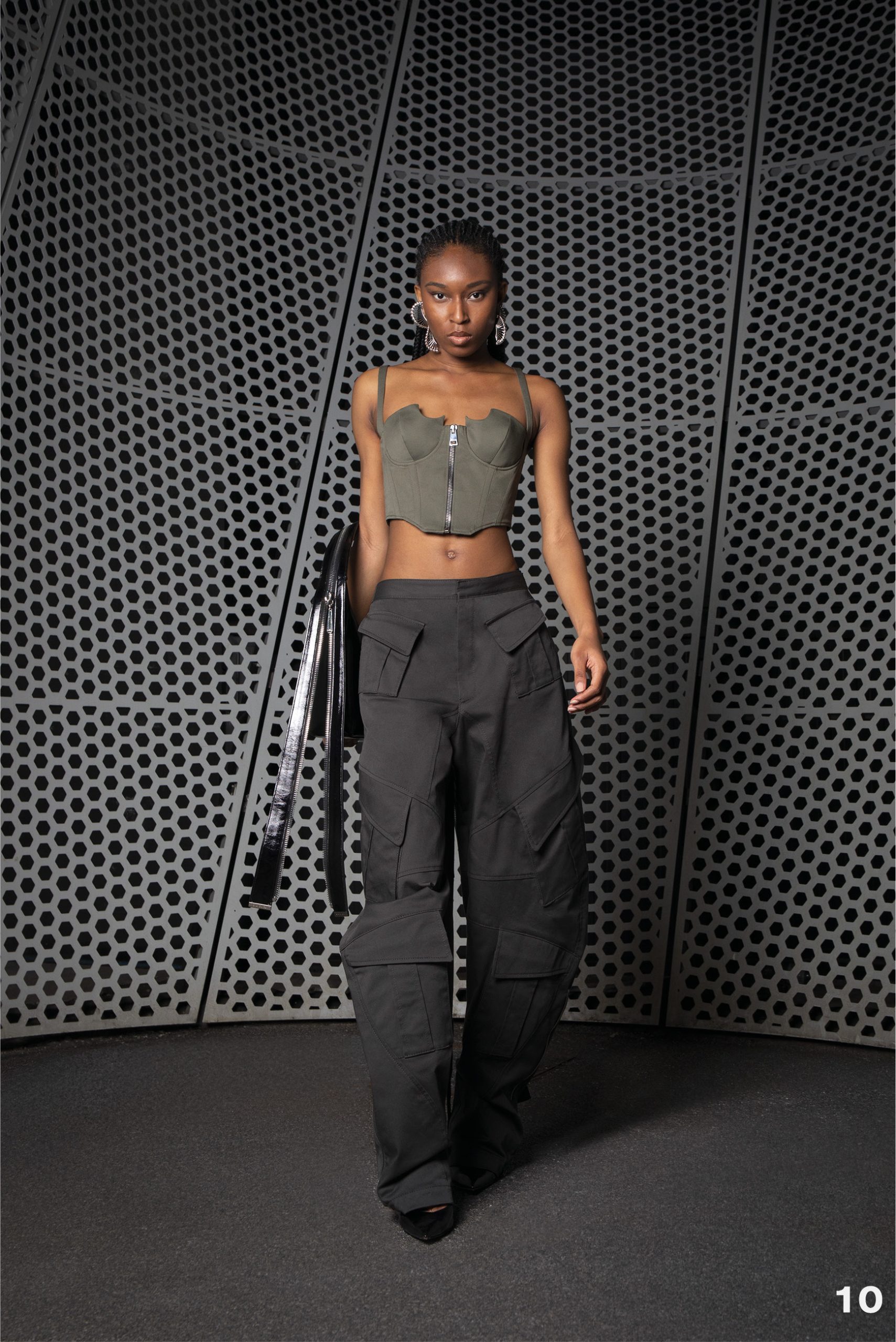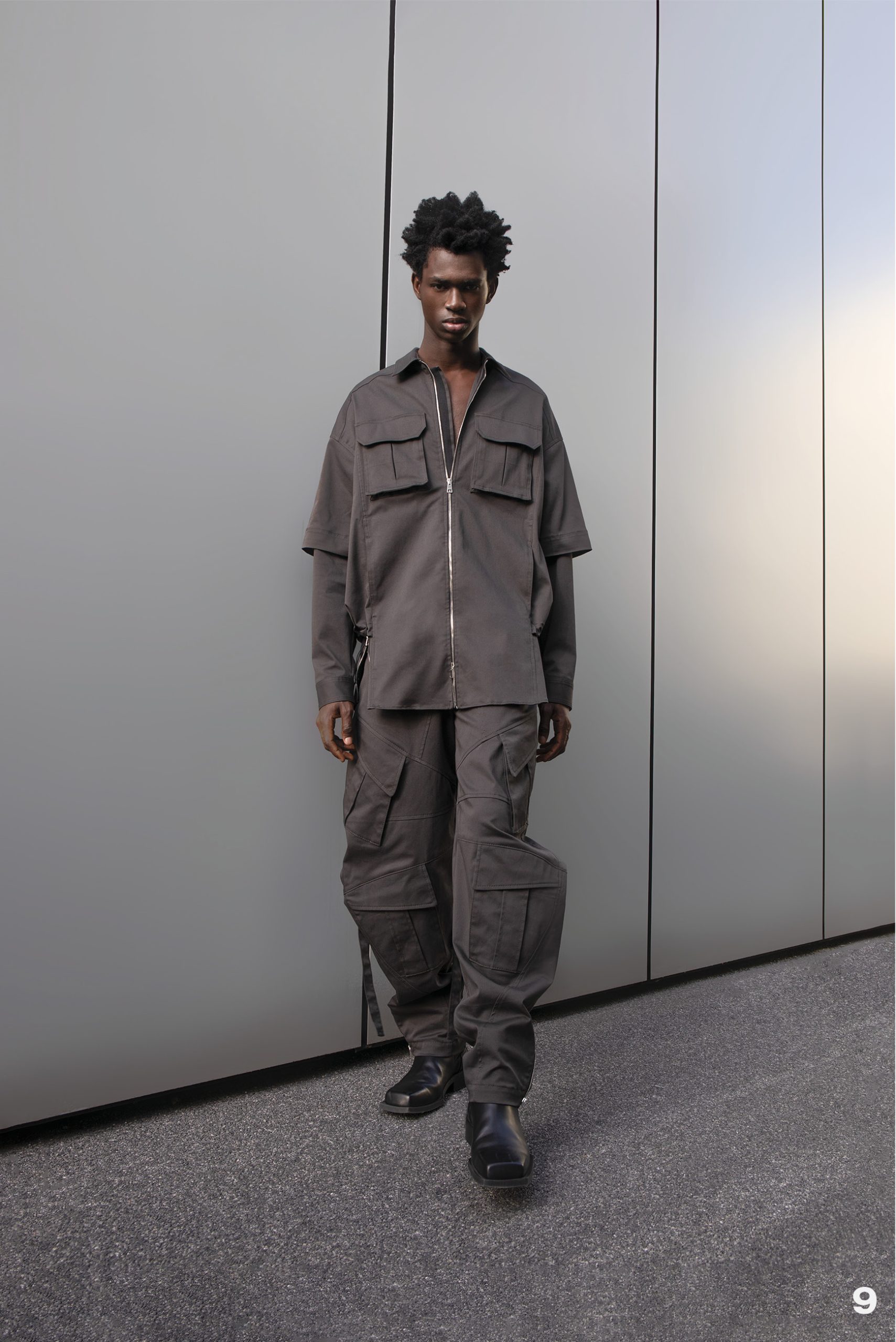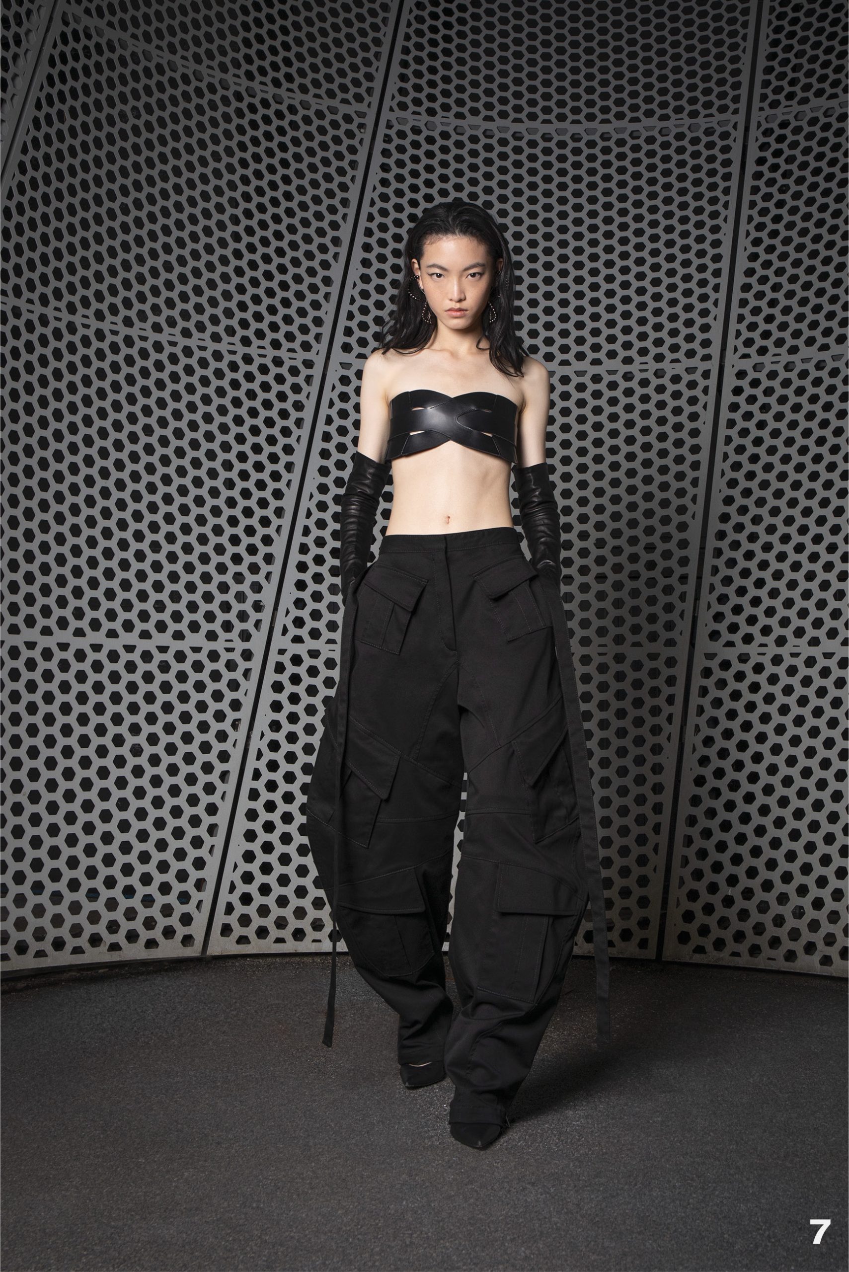 Daywear in cotone intrecciato per cargo oversize multi-tasche (e multi-tasking) con doppio fondo (contenuto vertiginosamente da una zip, o super-over aperte “a delta” al fondo, regolabile, a seconda delle necessità) e minigonne “inside out” esibiscono la mezza elica laterale, caratteristico tratto geneticamente creato nella Collezione.