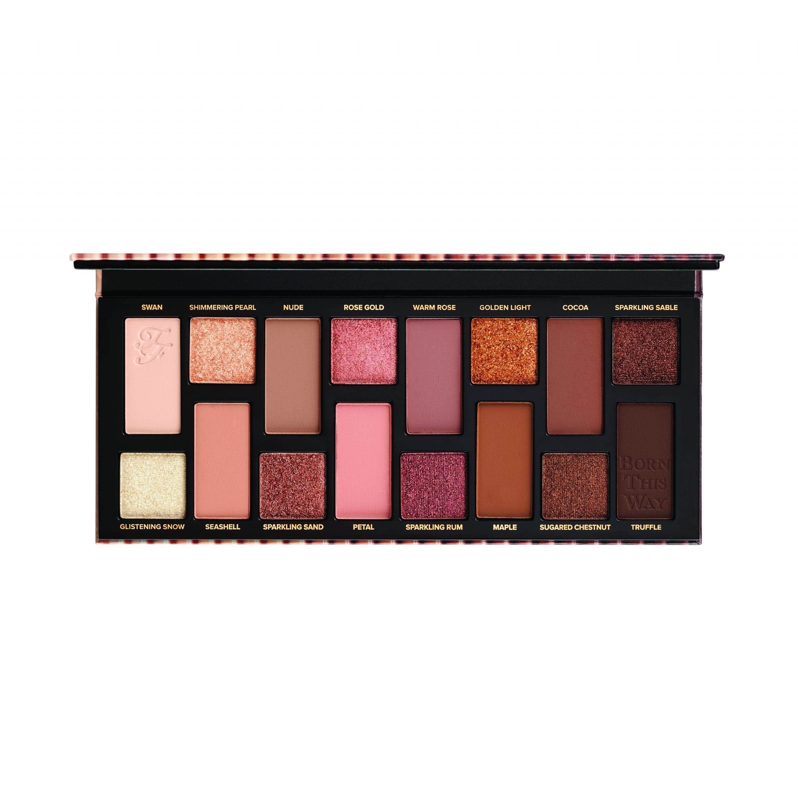 Ispirata alla tavolozza delle tonalità dell’iconico fondotinta Born This Way, questa palette composta da 16 nuance nude ultra pigmentate propone una selezione di ombretti mat, studiati per esaltare anche i toni più delicati di carnagione, e shimmer ideali per ottenere look intensi e uno splendore unico. Forti di una formula arricchita con olio di cocco, dalle proprietà riequilibranti, rosa delle Alpi, per conferire elasticità e tonicità alla pelle, e acido ialuronico, prezioso ingrediente anti-age, questa palette contiene 8 ombretti mat, 5 shimmer e 3 metallizzati.