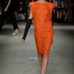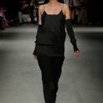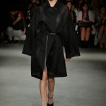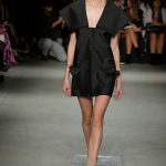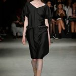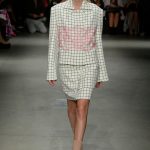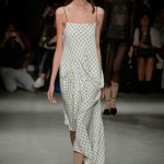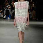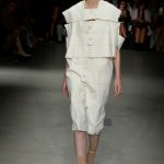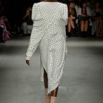 Le fasce multiple scandiscono capi a scatola in crepe aurei accoppiati e laserati al vivo. Check aristocratici incontrano i pizzi deco’ in capispalla e tuniche minimali, ampissimi colli diventano carrè appoggiandosi sulla spalla in stampe damier.