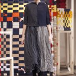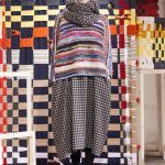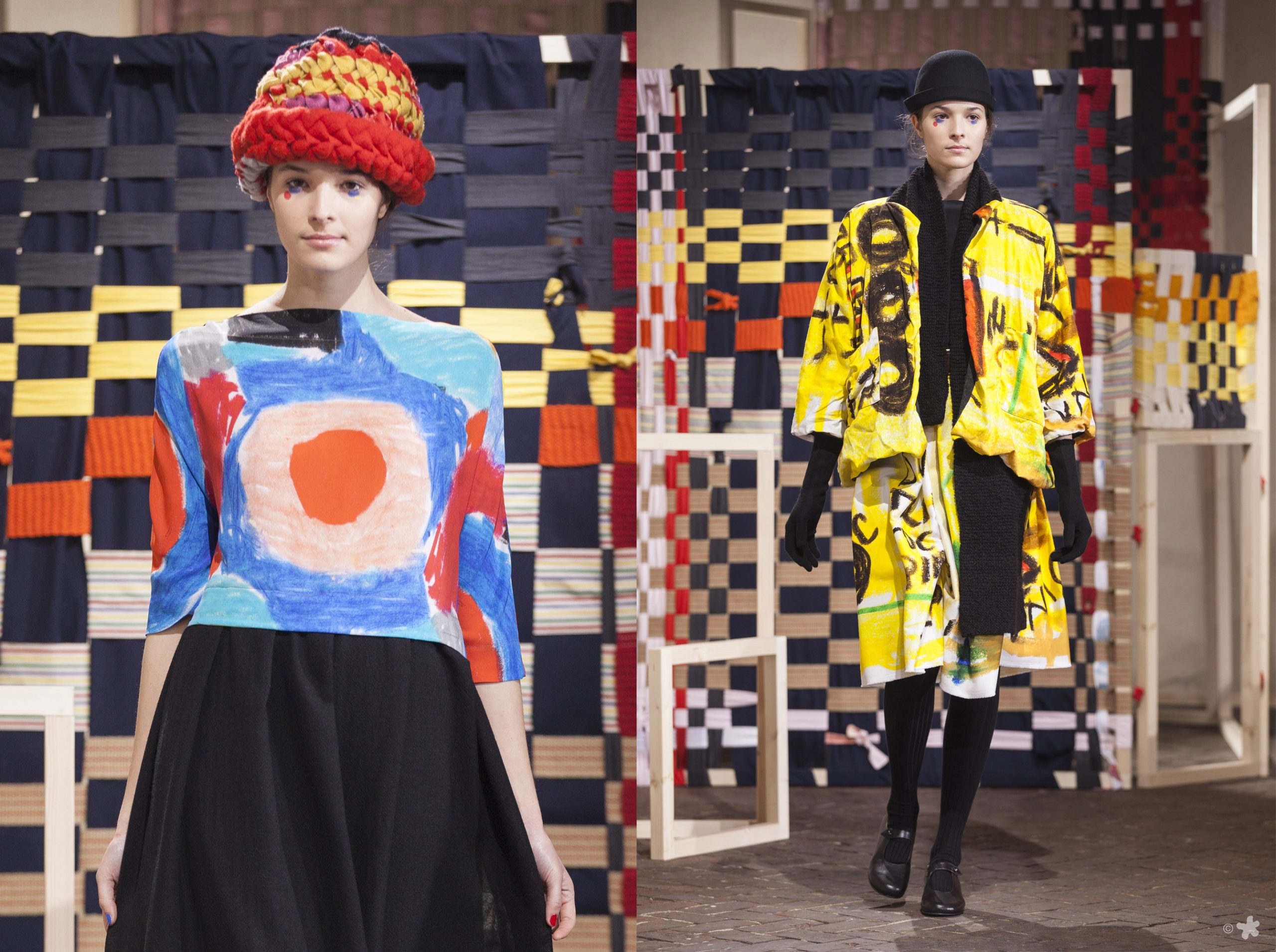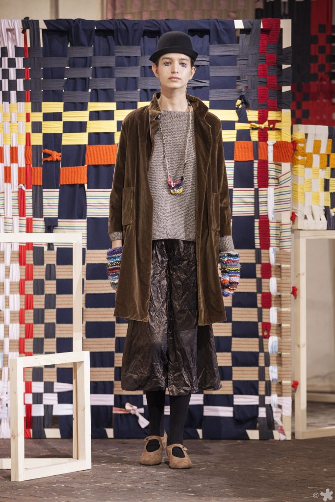 Da sempre fedele alla semplicità e alla comoda vestibilità, Daniela Gregis propone long dress stropicciati come fogli di carta bianchi scarabocchiati, giacche over size come fossero tele astratte, colli super colorati lavorati a mano come le cinture e i cappelli in lana.