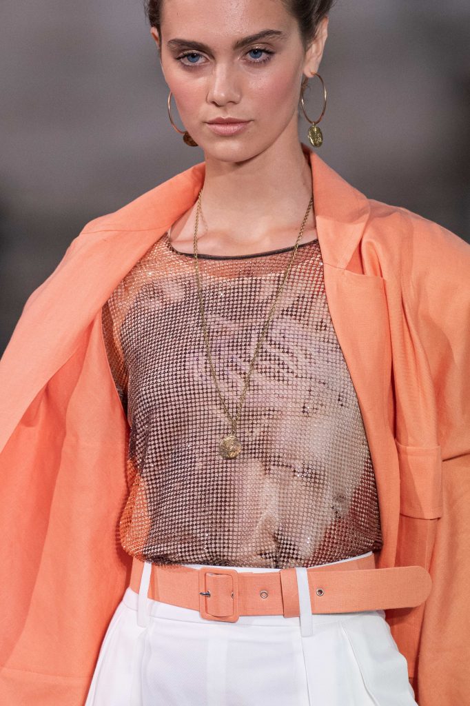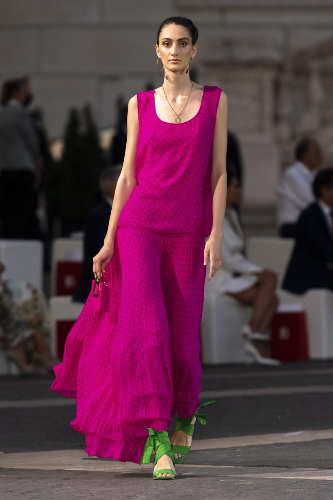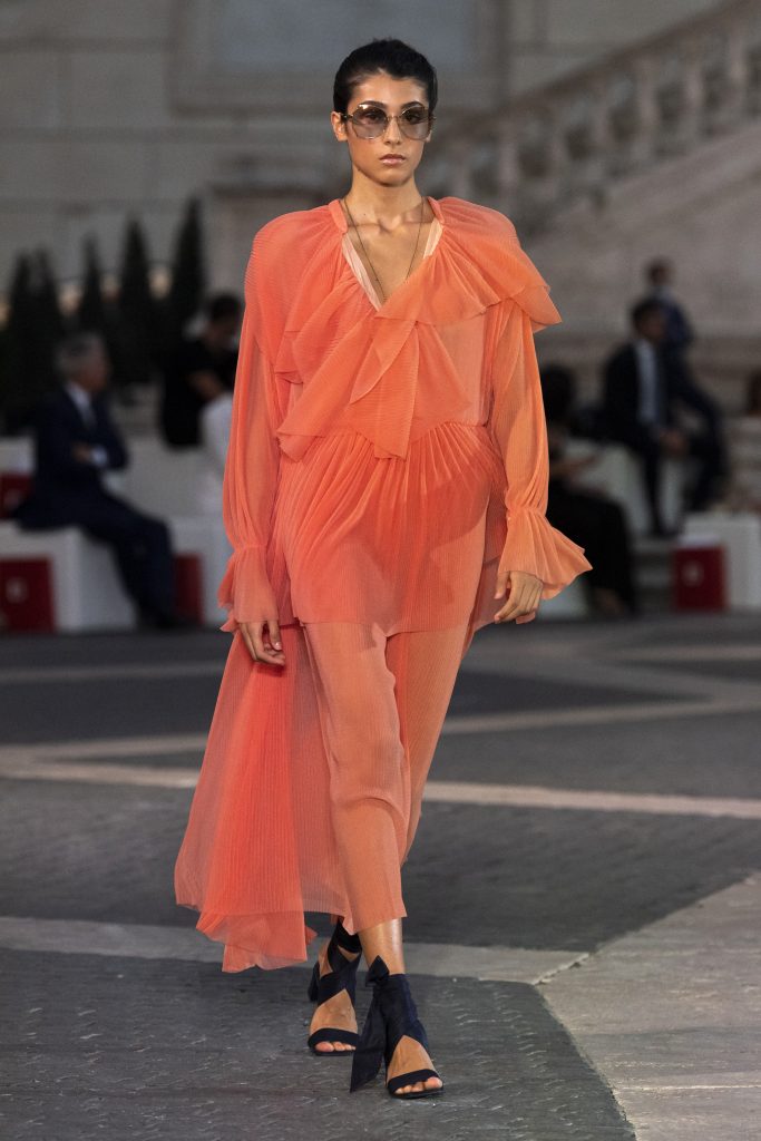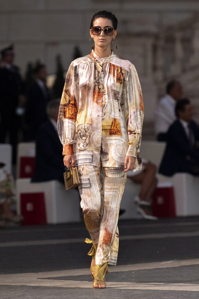 Sono abiti lunghi e lievi, plissettati e stampati a pois o con motivi floreali ricamati, sono completi che accostano in modo audace lampi di colori smaglianti a volte inconciliabili come il rosa ciclamino e il verde clorofilla, sono sensuali princesse imprimé a motivi neoclassici in sete impalpabili ma anche tailleur dalle spalle pronunciate ricchi di tasche, perché il comfort é l’arma segreta di ogni donna. Non manca l’iconico abito bambola ‘spazialista’ e mono taglia in taffetas cangiante color melanzana, più corto e frizzante. La novità è una stampa delicata di soggetti neoclassici mutuati dall’iconografia capitolina e applicati con grazia su reticoli di cristalli che irradiano luce e sicurezza.