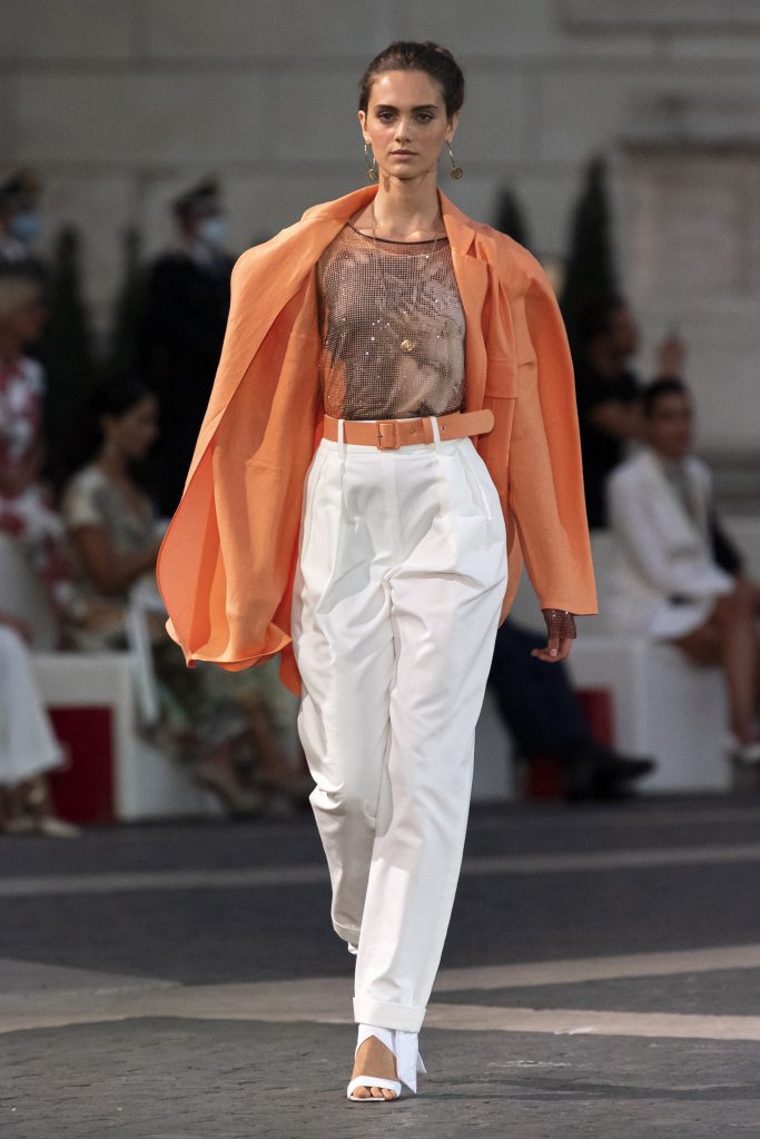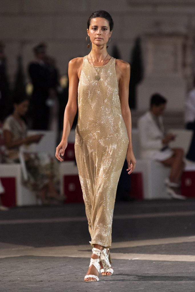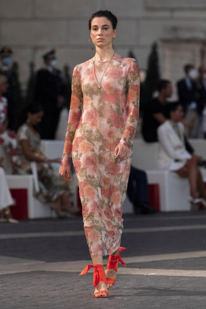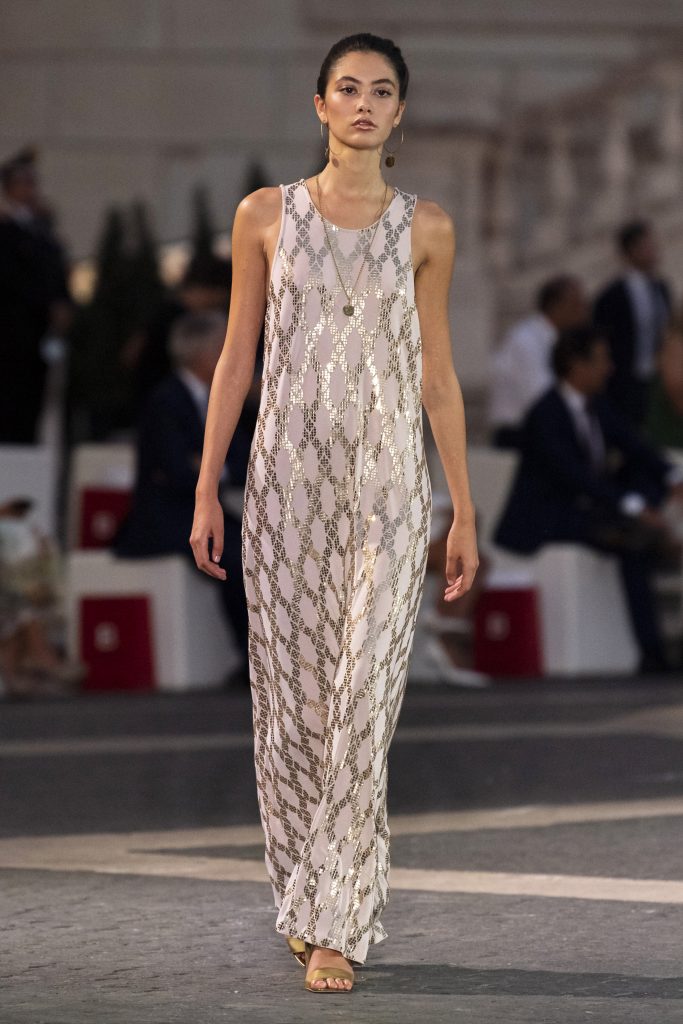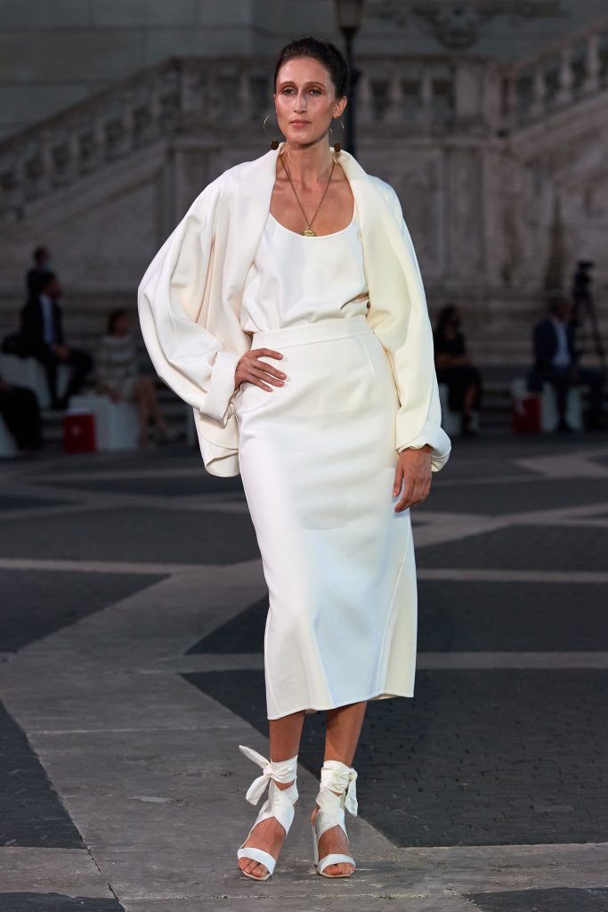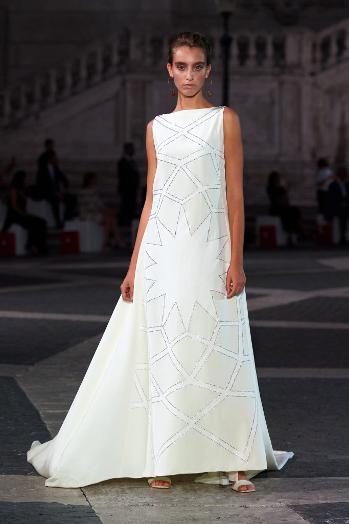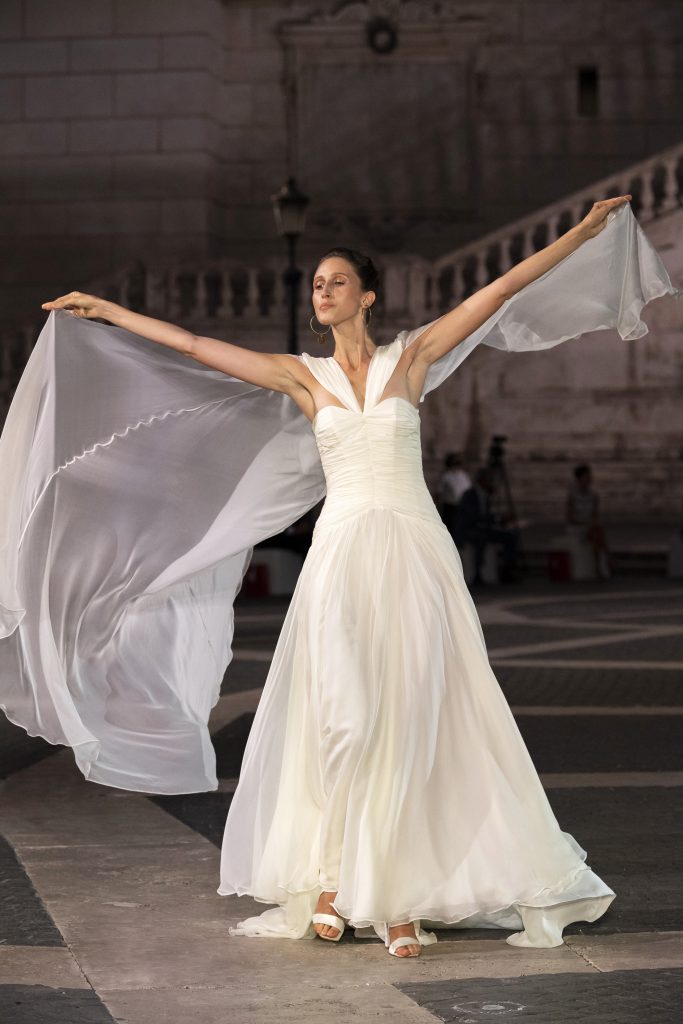 L’étoile dell’Opera di Roma Eleonora Abbagnato aleggia come una libellula avvolta in seta lamé plissé soleil guidando una schiera di leggiadre vestali che si muovono come sospese in aria sulle note del tema musicale del fim ‘Mission’ creato negli anni’80 da Ennio Morricone, altro pilastro del Made in Italy. Uno scroscio di applausi accoglie nel gran finale dello show la carismatica Anna Cleveland, altra performer in stato di grazia, che volteggia sulla piazza accarezzata da un peplo insostenibile in chiffon avorio. La precede una sposa con un abito che riproduce il sublime disegno della piazza. Esultano nel parterre (solo 100 invitati selezionatissimi) Romina Power e Nancy Brilly, Mara Venier e un’abbagliante Cristina Chiabotto, Massimiliano Rosolino e Milly Carlucci, senza contare Laura Chiatti, ambasciatrice dell’ultimissima fragranza della maison, e le autorità istituzionali: Virgina Raggi, Luigi Abete, Stefano Coletta Direttore di Rai 1 e Pierluigi Monceri direttore regionale di Intesa San Paolo. Un en plein fra fashion e mondanità, perché ciò che conta è ripartire col piede giusto, ed è nella bellezza in fondo che la società può disegnare il suo futuro.