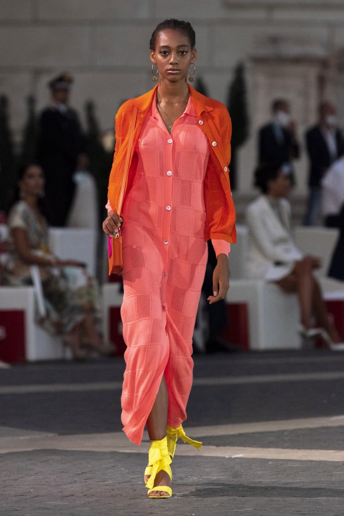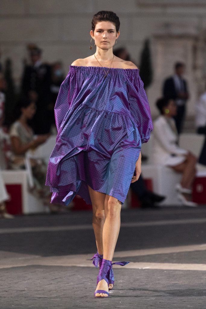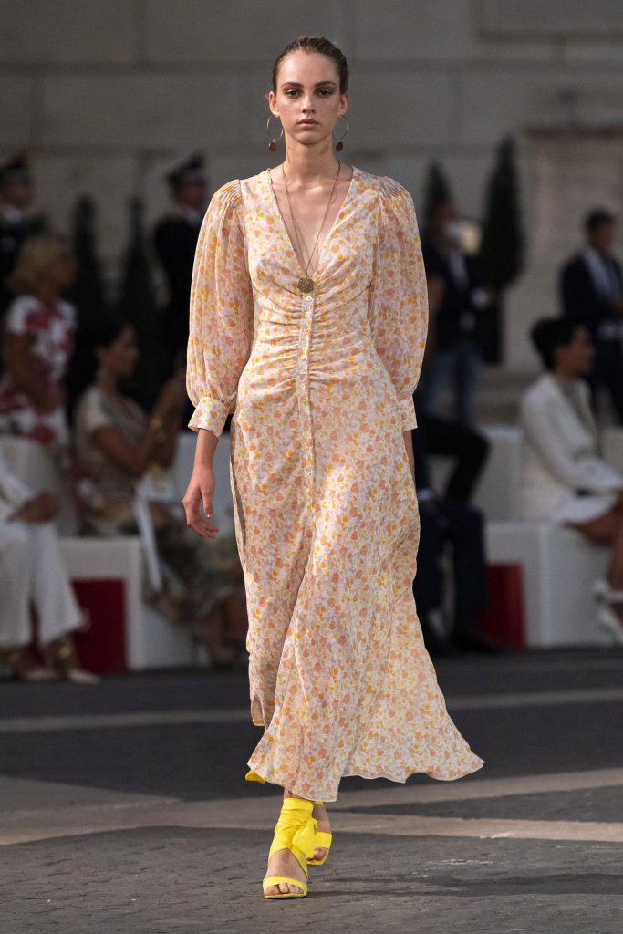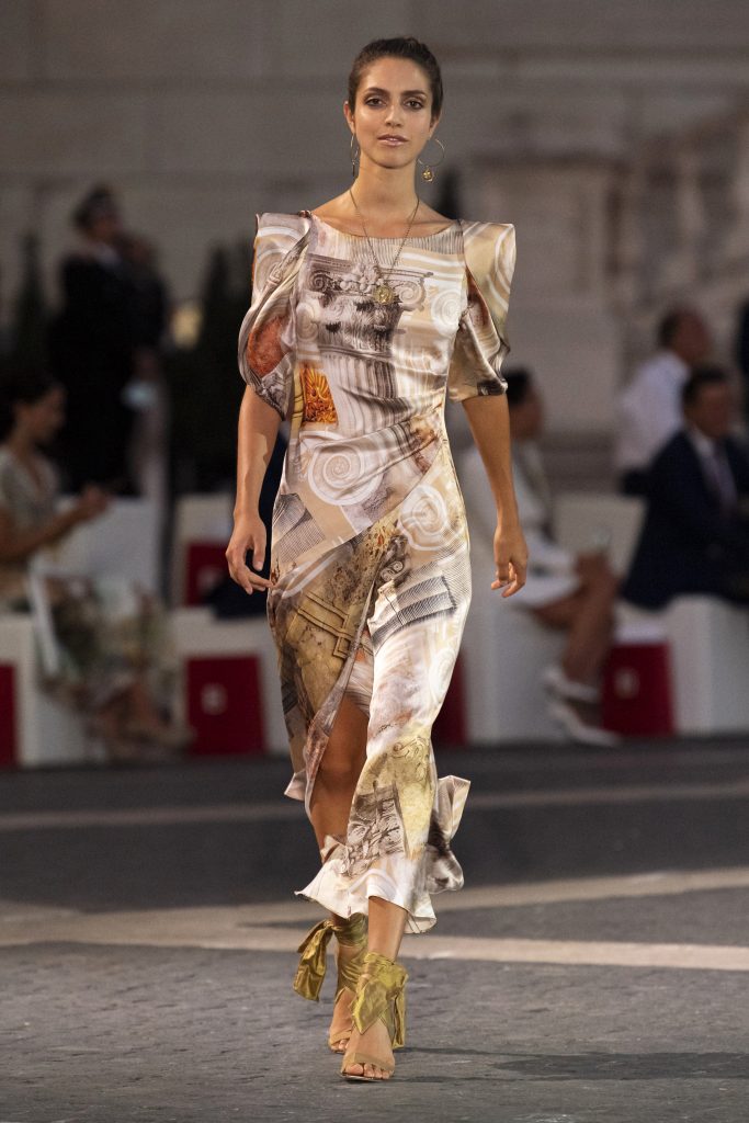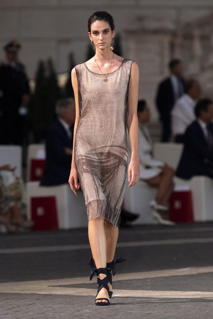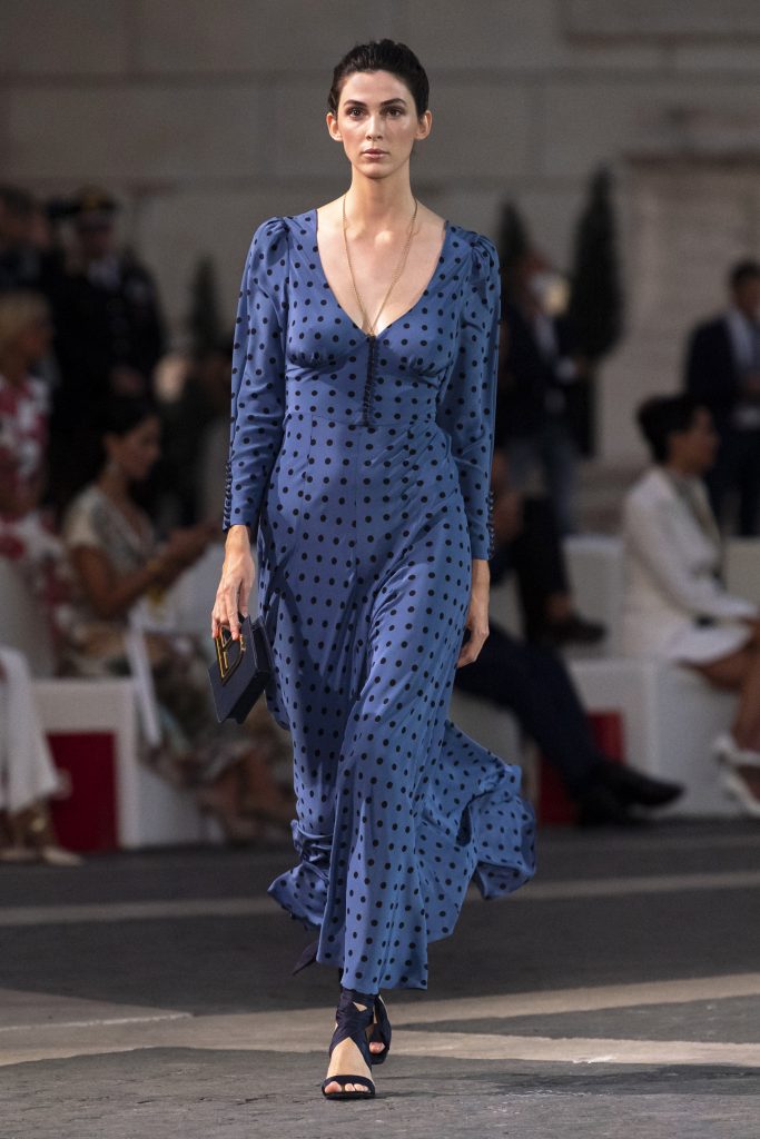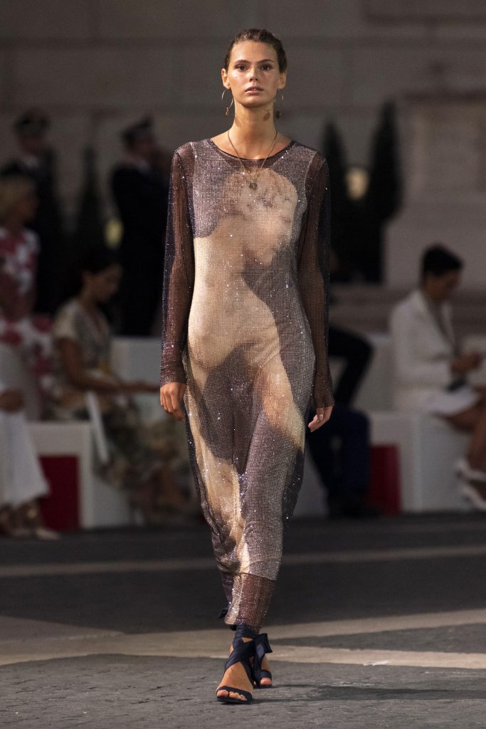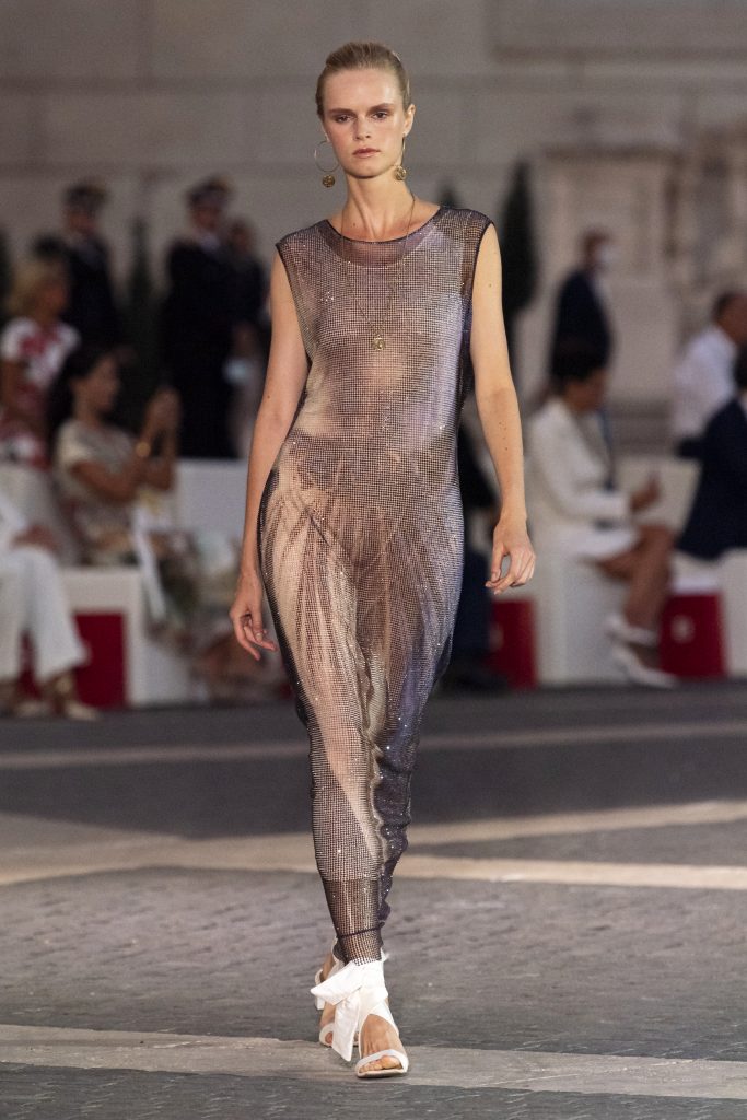 L’étoile dell’Opera di Roma Eleonora Abbagnato aleggia come una libellula avvolta in seta lamé plissé soleil guidando una schiera di leggiadre vestali che si muovono come sospese in aria sulle note del tema musicale del fim ‘Mission’ creato negli anni’80 da Ennio Morricone, altro pilastro del Made in Italy. Uno scroscio di applausi accoglie nel gran finale dello show la carismatica Anna Cleveland, altra performer in stato di grazia, che volteggia sulla piazza accarezzata da un peplo insostenibile in chiffon avorio. La precede una sposa con un abito che riproduce il sublime disegno della piazza. Esultano nel parterre (solo 100 invitati selezionatissimi) Romina Power e Nancy Brilly, Mara Venier e un’abbagliante Cristina Chiabotto, Massimiliano Rosolino e Milly Carlucci, senza contare Laura Chiatti, ambasciatrice dell’ultimissima fragranza della maison, e le autorità istituzionali: Virgina Raggi, Luigi Abete, Stefano Coletta Direttore di Rai 1 e Pierluigi Monceri direttore regionale di Intesa San Paolo. Un en plein fra fashion e mondanità, perché ciò che conta è ripartire col piede giusto, ed è nella bellezza in fondo che la società può disegnare il suo futuro.