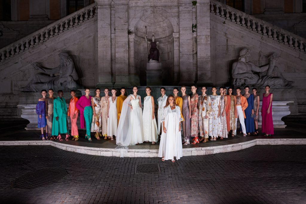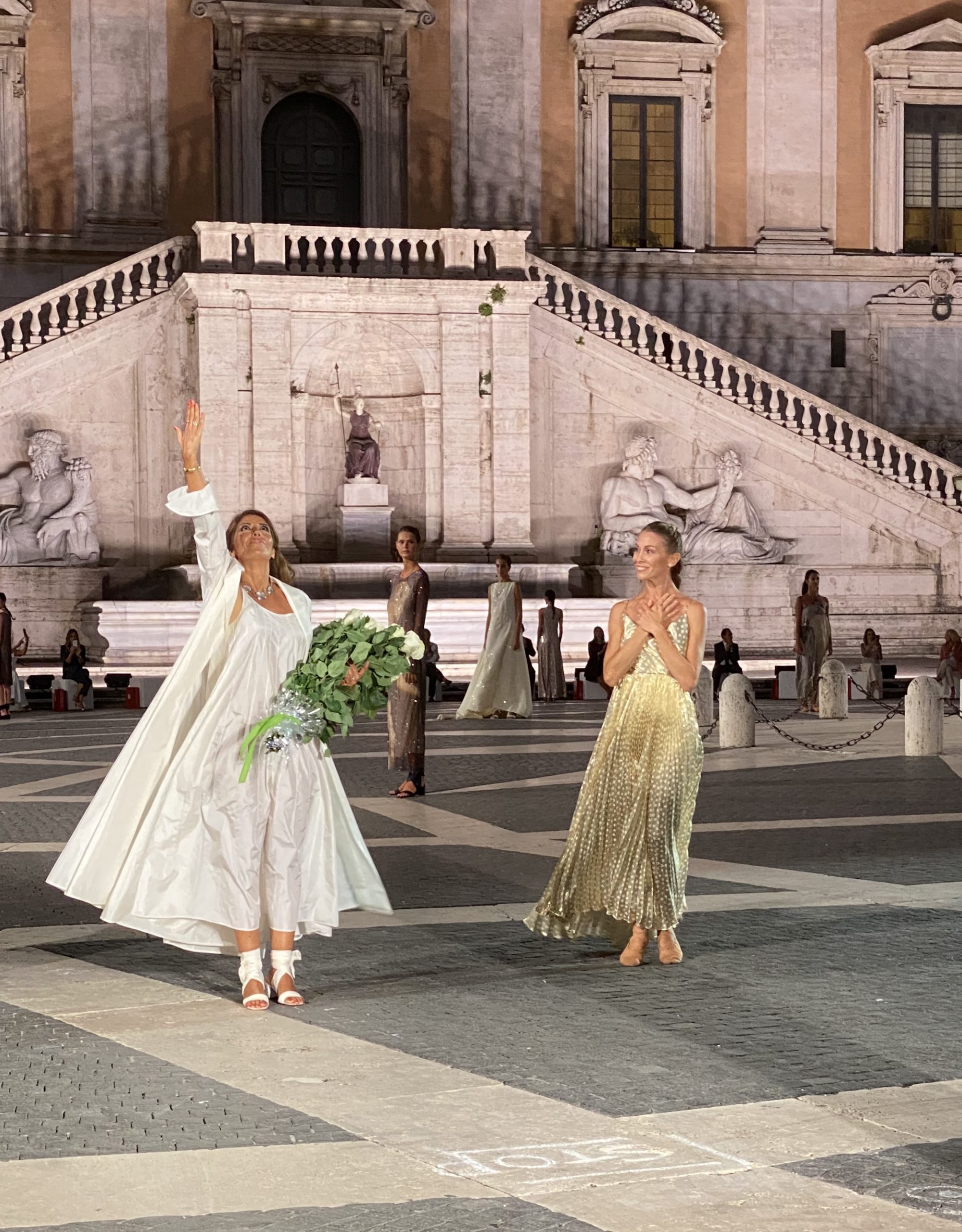 “Sono abiti con l’anima quelli che sfilano in questa magica cornice, luminosi, confortevoli e fatti per durare, pensati per regalare libertà a chi li indossa; è bello quando qualcuno ti ferma per strada e ti racconta che ancora possiede e indossa un capo disegnato da tua madre, perché significa che quello che facciamo ha un senso, che può durare nel tempo”, dichiara vibrante Lavinia. “Con questo evento, reso possibile anche dal Comune di Roma e dalla sindaca Virginia Raggi (presente all’anteprima stampa dell’evento in Campidoglio nell’aula consiliare n.d.r.), intendiamo ribadire la centralità del genius loci nel nostro percorso futuro perché la nostra rinascita parte proprio dai luoghi che amiamo e in cui viviamo, e dei quali abbiamo il dovere di preservare le eccellenze artistiche e culturali”. Ed è un’ipnotica performance di danza a siglare e coronare questa ideale ‘rinascita’ in Campidoglio della moda italiana alla fine di questa memorabile serata di moda e musica diretta magistralmente da Sergio Salerni.