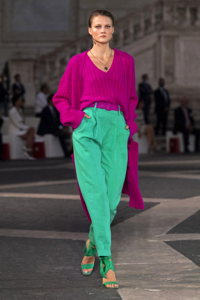 Colta e raffinata mecenate, Laura Biagiotti ha ristrutturato il Castello Marco Simone alla fine degli anni’70 per farne la sua sede e il suo quartier generale ma anche il suo buen retiro. Testa solida e cuore tenero, la ‘dama bianca’ della moda italiana ha saputo tracciare un percorso illuminato di stile e raffinatezza nel segno della nobiltà del cachemire, un itinerario avventuroso volto anche alla valorizzazione della bellezza che ci circonda, partendo da Roma. Qui ha finanziato nel 1999 il restauro della scalinata cordonata del Campidoglio, dei Dioscuri e della fontana di Piazza Farnese. Ora Lavinia, prosegue il retaggio della sua grande mamma, scomparsa nel maggio 2017, finanziando il restauro estetico e funzionale della fontana della dea Roma in Piazza del Campidoglio, un’operazione importante per la città, supportata anche da Banca Intesa che prima della serata ha annunciato nuove iniziative a sostegno della moda italiana ma anche dei suoi giovani virgulti. In scena al tramonto sulla storica Piazza in cui la statua equestre di Marco Aurelio sorveglia sempre vigile le sorti della capitale, scivolano sulle note delle magiche musiche di Ennio Morricone, le eteree creazioni per la primavera-estate 2021 della maison.