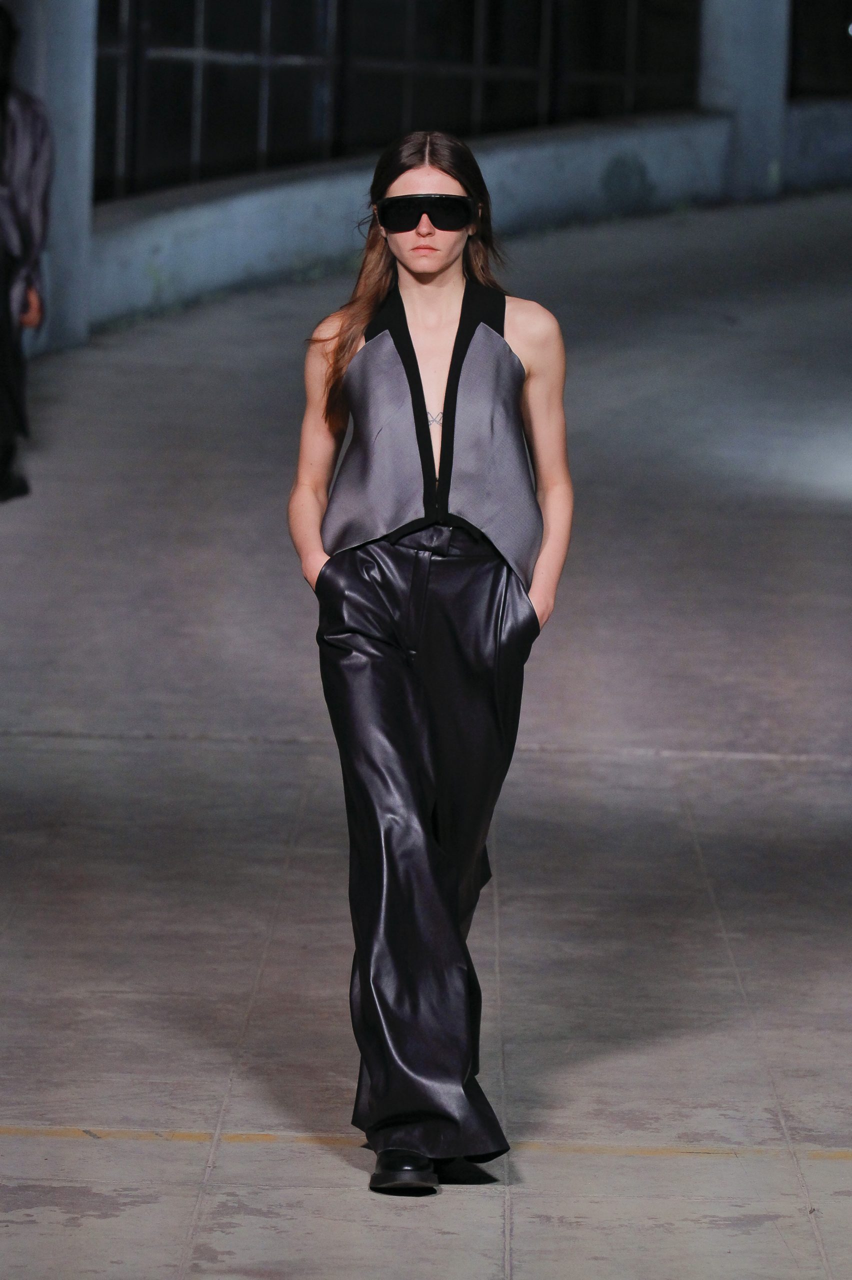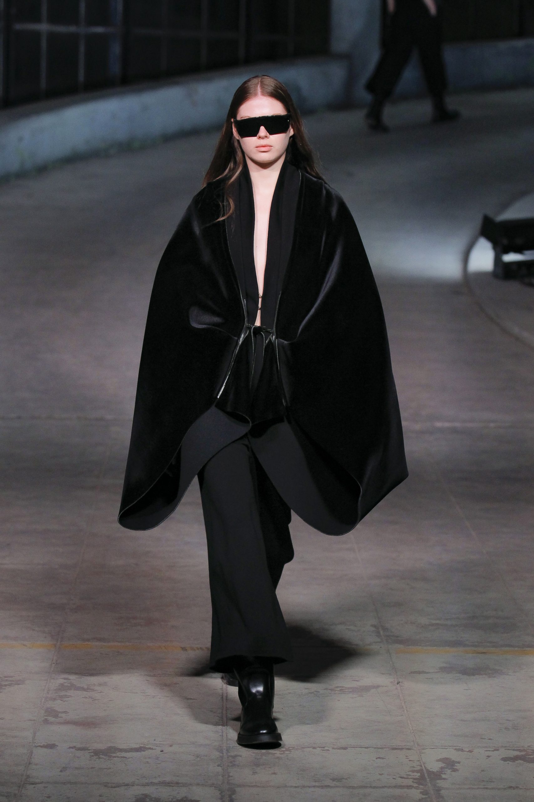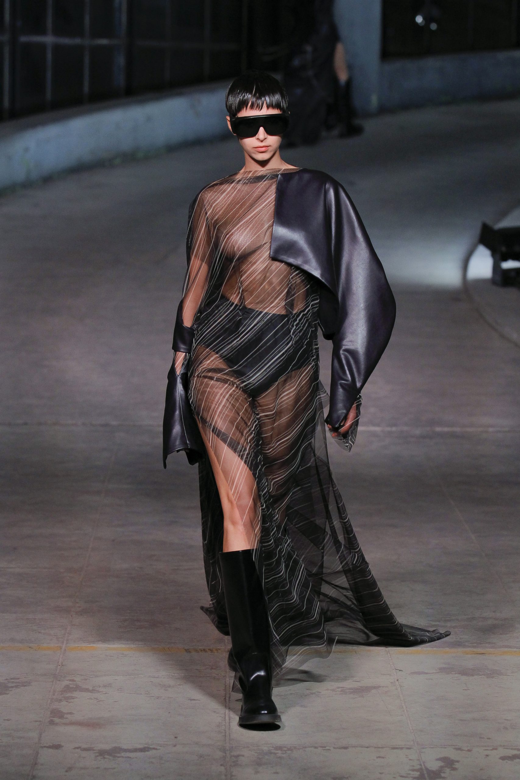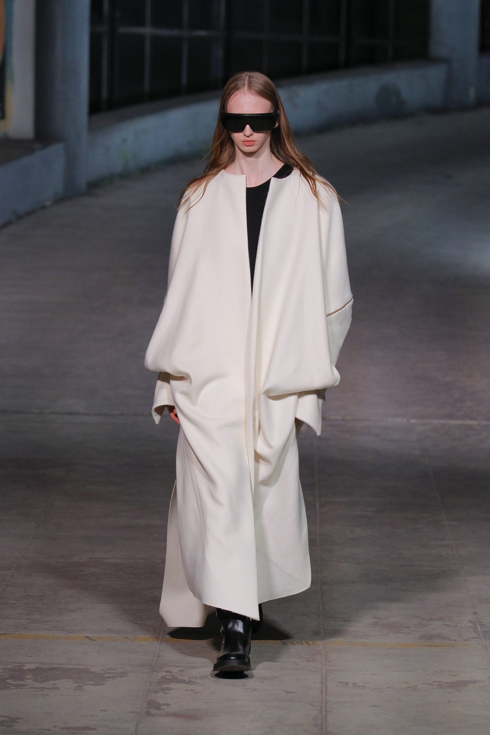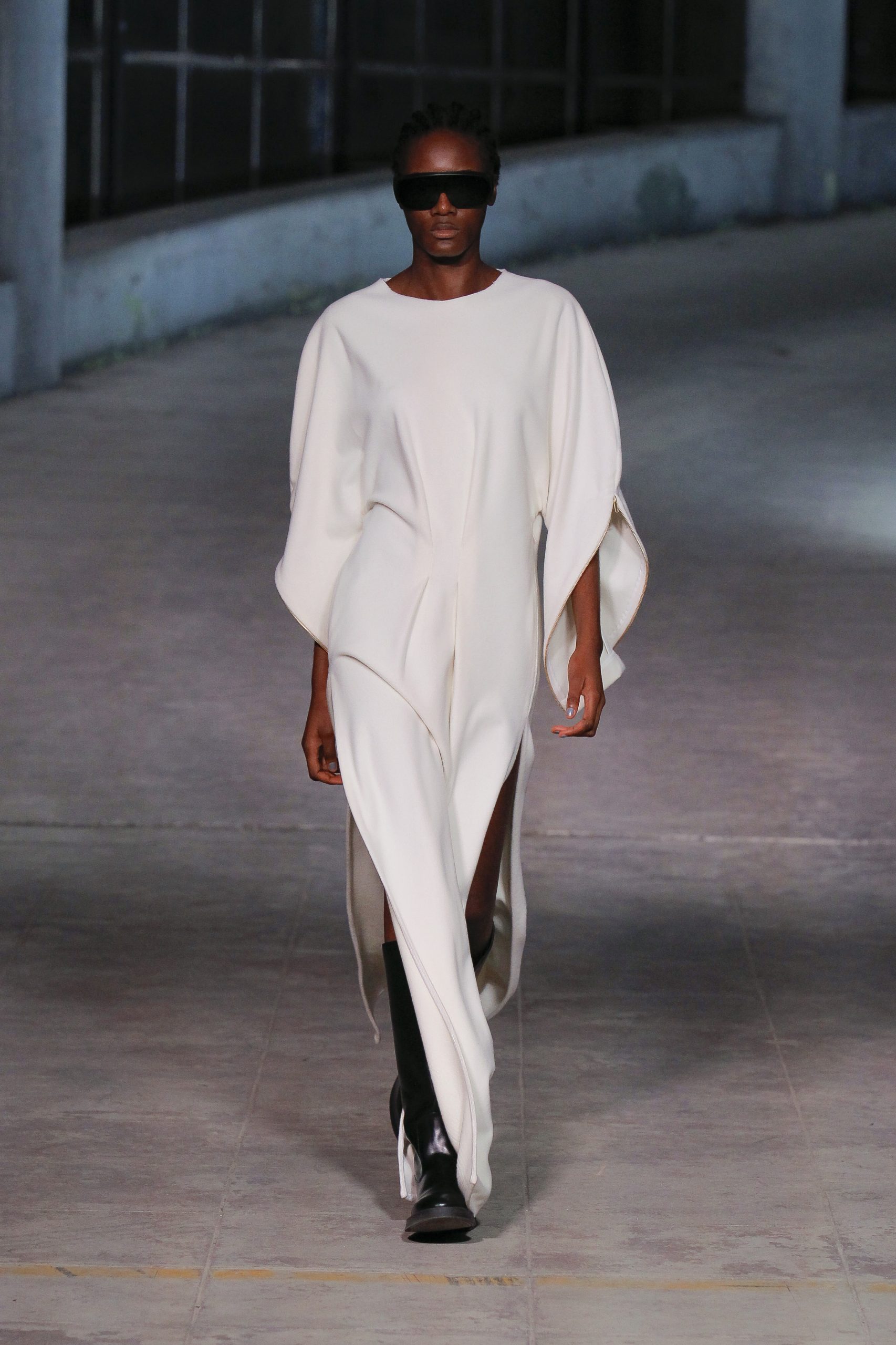 Il techno-velluto è usato negli abiti a tunica a collo alto, per i bubble-bombers o ancora per i completi marziali. La lana viene usata nell’abito lungo bianco, plissettato come una “pietra cesellata”.