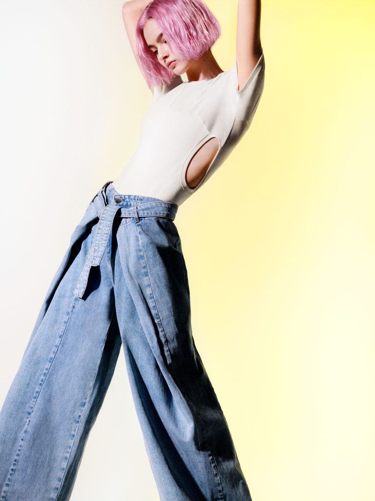 Il denim è uno dei materiali protagonisti della collezione. Maitrepierre lo immagina in rosa pallido (pagina accanto, a sinistra) per creare un completo di pantaloni e giacca multiposizione: chiudendo i bottoni a pressione, diventa un poncho. Ma anche sotto forma di jeans snow bleach, un vestito con bretelle apparentemente semplice il cui taglio è davvero innovativo, e di pantaloni con gamba super ampia, che possono essere indossati con la cintura allacciata o slacciata, per creare due diverse silhouette. Altri tre vestiti completano la serie di fotografie: uno, con trompe l’oeil sullo scollo (nell’intestazione di questo comunicato stampa); un altro, bicolore e con doppie bretelle, molto originale; e un terzo, con una stampa stile cosmico in rosa e arancione.